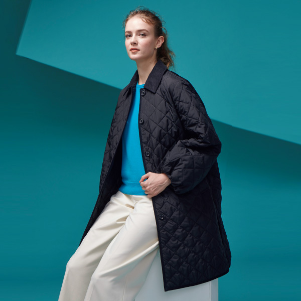 再生ポリエステル素材「BRING Material™」を使用したキルティングロングコート。柔らかな雰囲気のパフスリーブと、ドットのサイドベントが特徴的で、着心地は軽やかです。