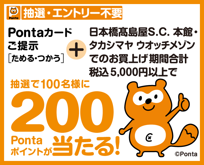 期間中、日本橋高島屋S.C. 本館・タカシマヤ ウオッチメゾンにてPontaカードをご提示(ためる・つかう)のうえ、期間合計税込5,000円以上お買上げのお客様の中から、抽選で100名様に200Pontaポイントが当たります。