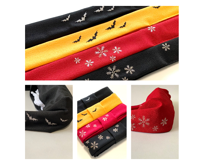 結ばない新発想の『楽々おびあげ』は、差し込むだけで美しく仕上がる画期的な帯揚げとして好評です。