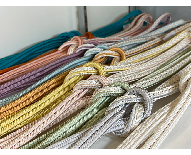 発色豊かで絹糸の手触りも心地よく、四季を通して着用でき、職人が一つ一つ組み上げた帯締めは締め心地が抜群です。
