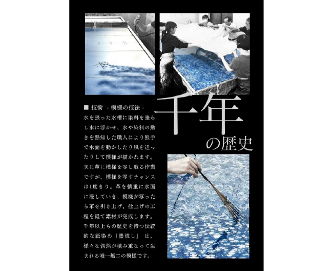 染料を水面に垂らし自然に広がる模様を革に写し取る全島技法を採用したシリーズです。