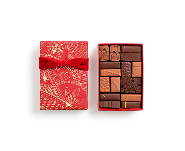 2025年クリスマス限定フレーバー2種(コメ入りのミルクプラリネ、バヌアツ産カカオのダークガナッシュ)と、人気定番のダーク、ミルクのガナッシュやプラリネなどを詰め込んだ2025年クリスマス限定ボックス。