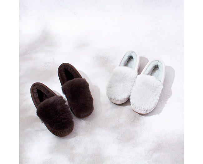 人気定番モカシン、表は上質なスエードを、内側は厳選した柔らかいシープスキンをはり合わせているのでソックスいらずで、素足で履いても心地よく過ごせます。