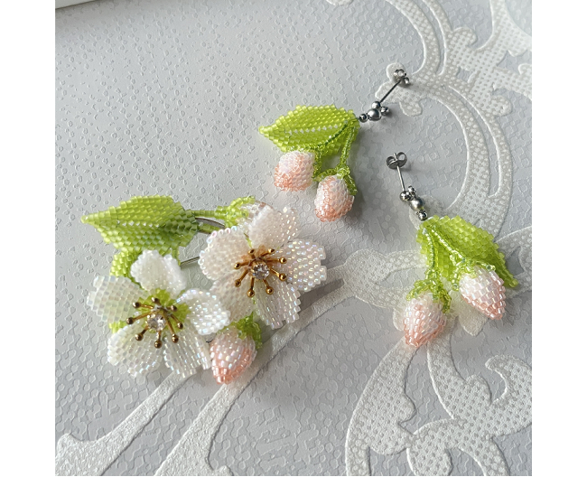 「大島桜のブローチ」16,500円、「大島桜のピアス」7,700円