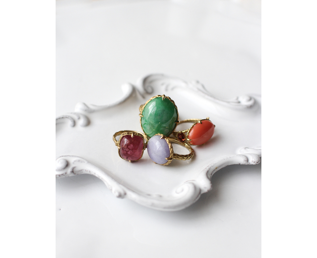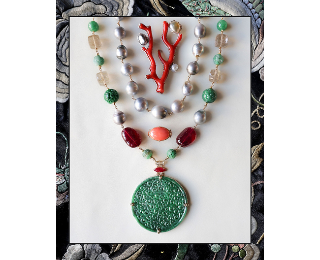 深いニュアンスを帯びて輝く彫刻の翡翠や艶やかな珊瑚、表情の豊かさが魅力の白蝶・黒蝶バロック型パールなど…
