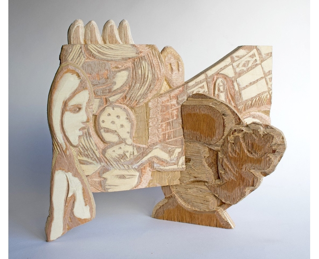 今展では制作意図はそのままに、積層構造をもつ合板でレリーフを素材に制作することで、形に沿って等高線のように層が現れる立体的な要素と、線彫りを施した際に彫り跡のみ色味が変化して見える平面的な要素、その両方を併せ持つ合板を用いることにより表現したい空間の自由度がさらに高まると感じたと浅野井氏は語ります。