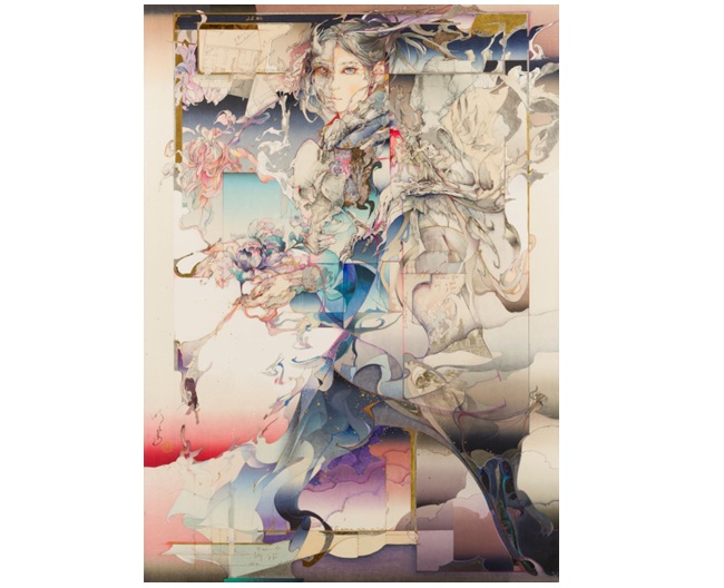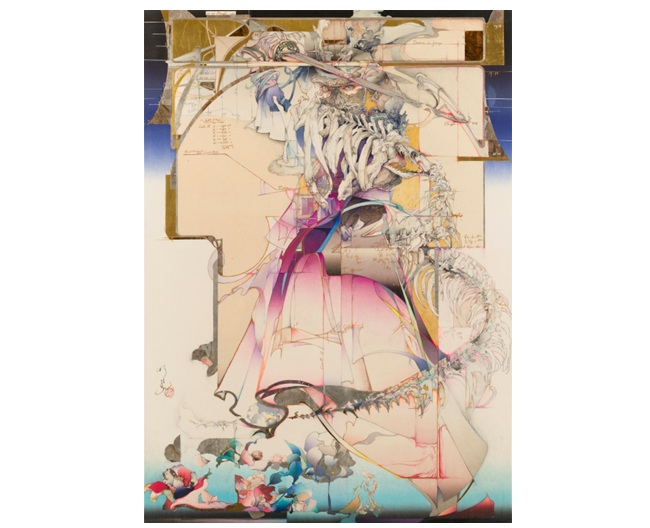 入江明日香氏の作品制作において、現在中心となっているミクストメディア作品は、鉛筆で描いた下絵が完成した後に、和紙に刷った銅版画によるコラージュと筆の描画を駆使した独自の技法として、近年より緻密さを増しています。銅版画の繊細な線の表現と、作家による自由な発想により組み合わされた図像や意匠は互いに共鳴し合い、創意を超えた必然とも言える状態となった作品に多くのファンが魅了されています。