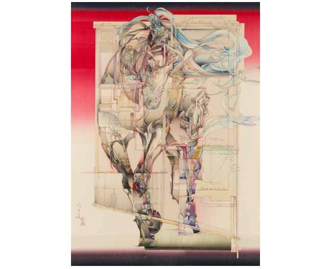 本展では、作家の新たな試みとして、入江氏が敬愛するフランスの建築家エクトール・ギマールの建築図面デッサンを背景に取り人れ、今年の干支の馬、龍、人物を100号サイズで初めて5点同時に発表することになりました。また、それぞれの会場ごとにしか展示されない作品も含め、20余点が展観されることになり、各会場で異なる展示風景を体験いただけます。