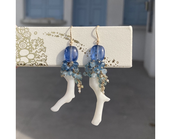 『ガウディ』コレクションの白い枝珊瑚にブルー系カラーストーンをふんだんにあしらったピアス。