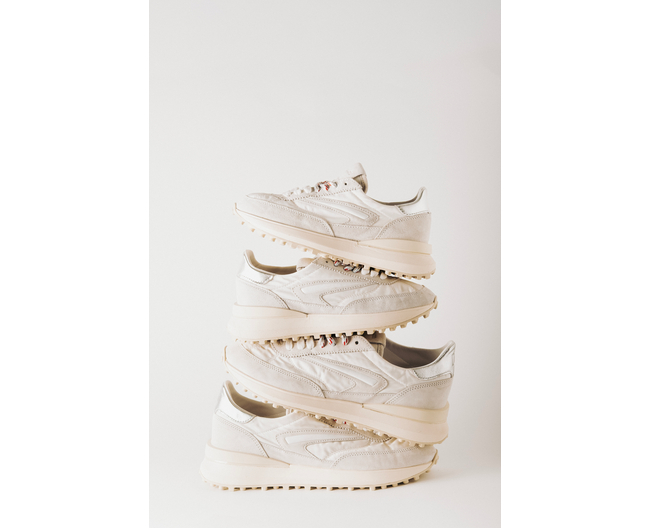 POP UP限定カラーの「ATHLETA」はホワイトをベースにシルバーをアクセントにしたデイトらしい一足。レザーとファブリックのコンビで仕上げ、柔らかな履き心地。