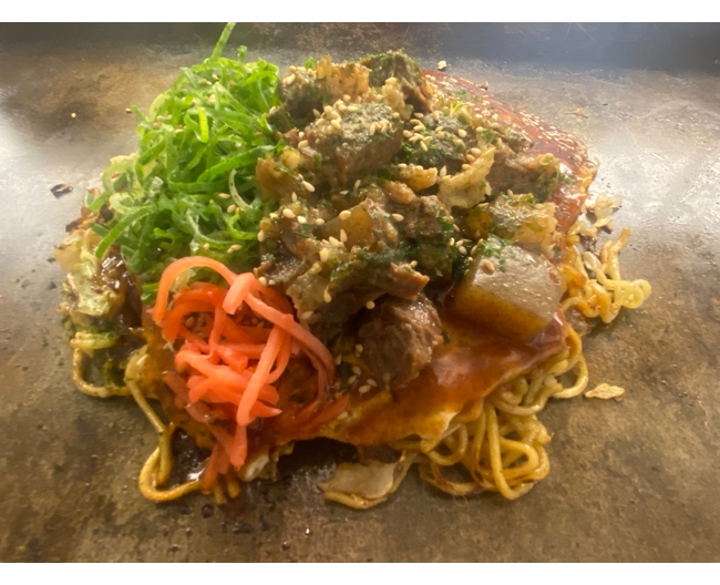 じっくり煮込んだ牛すじをかけたお好み焼きです。