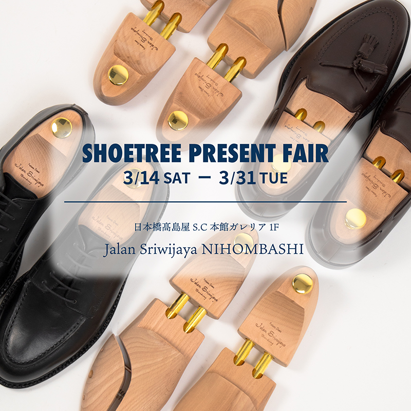 日頃のご愛顧に感謝を込めて、Jalan Sriwijayaの靴をお買上げのお客様に、先着で「ブナ木製オリジナルシューツリー」をプレゼントいたします。