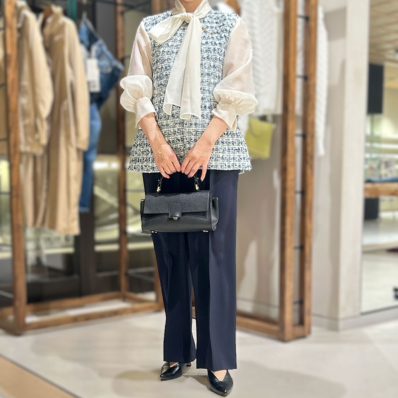 顔周りを明るく見せてくれる大きなリボンブラウスで、ほどよく甘さをプラスして。