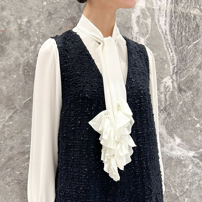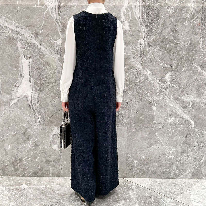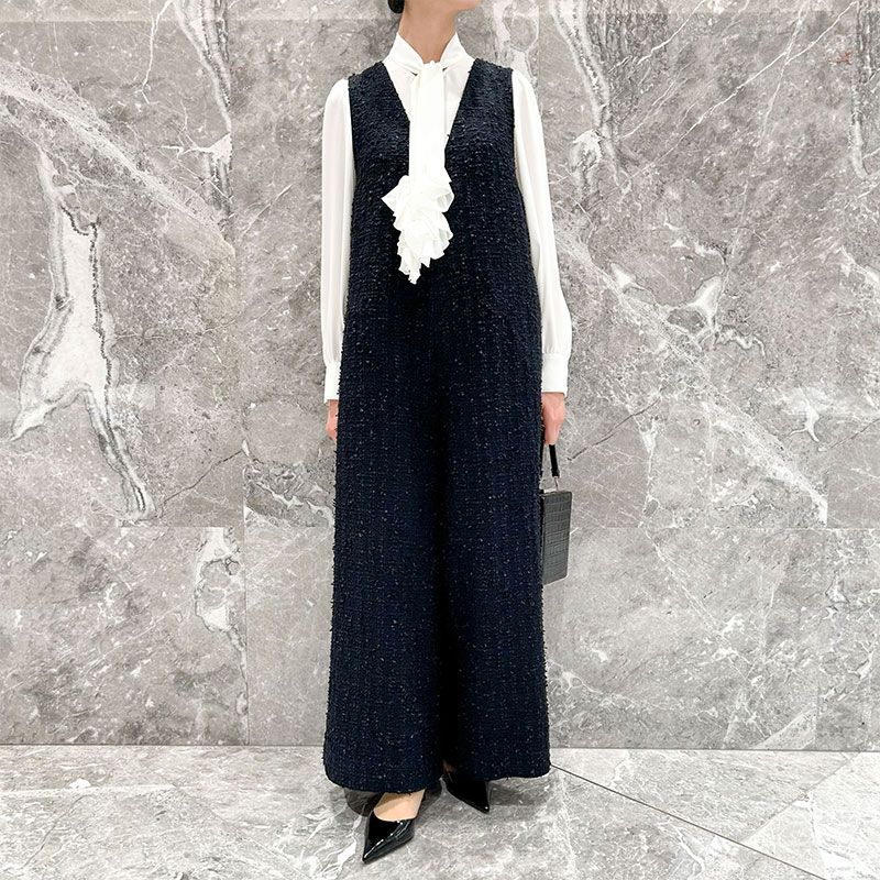 クラシックなファンシーツイードのオールインワンに、花びらのようなフリルをあしらったボウタイブラウスを合わせて華やかに。