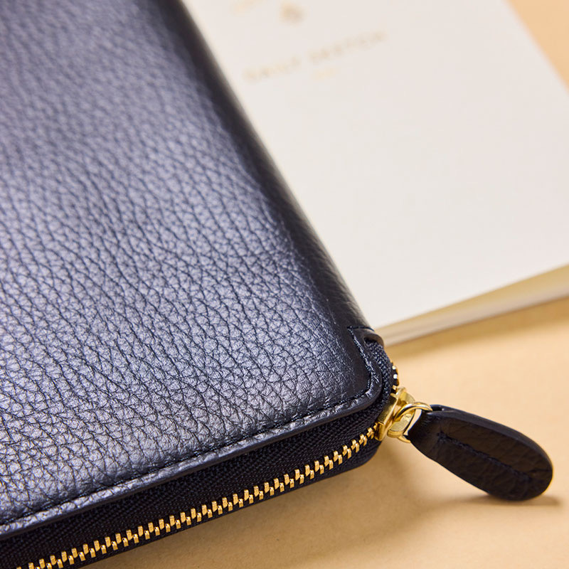 しっとりとした質感のシュリンクレザーは、発色がよく、内側まで贅沢に使った革とゴールドの刻印が、高級感を演出します。