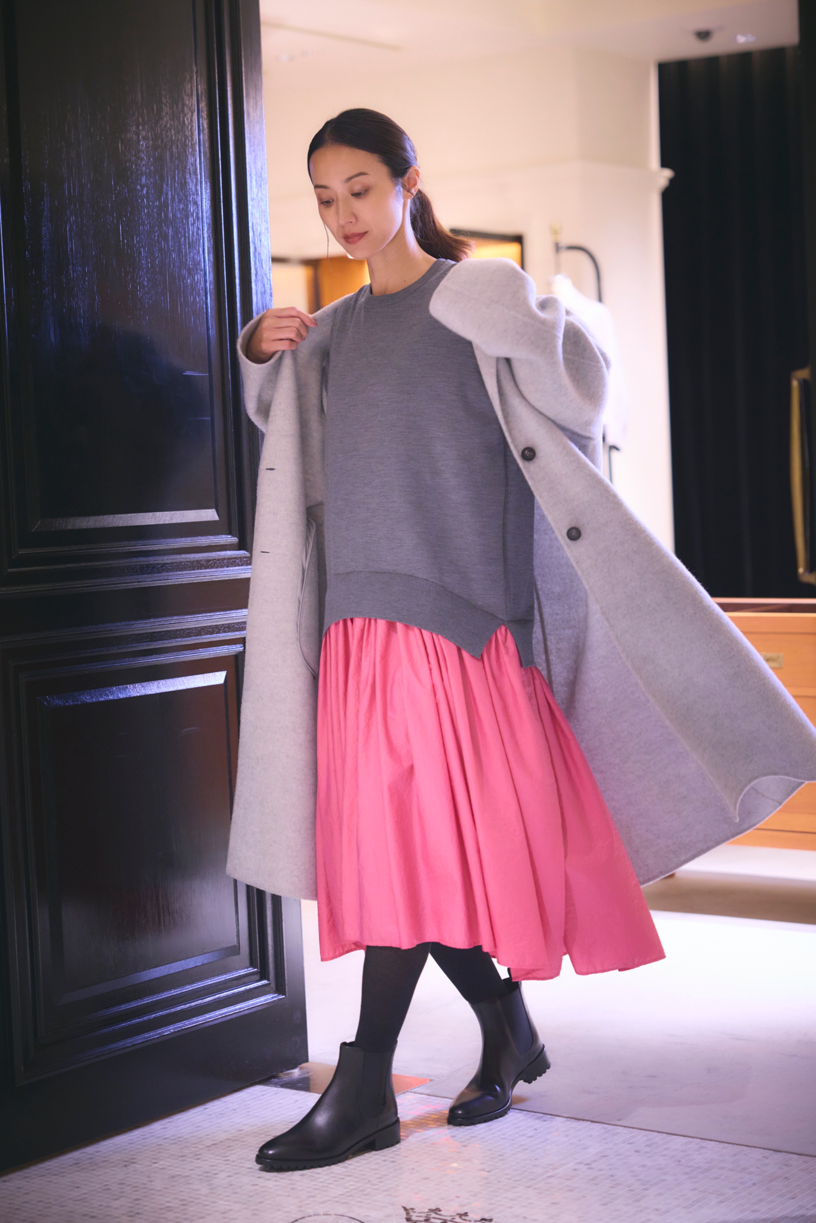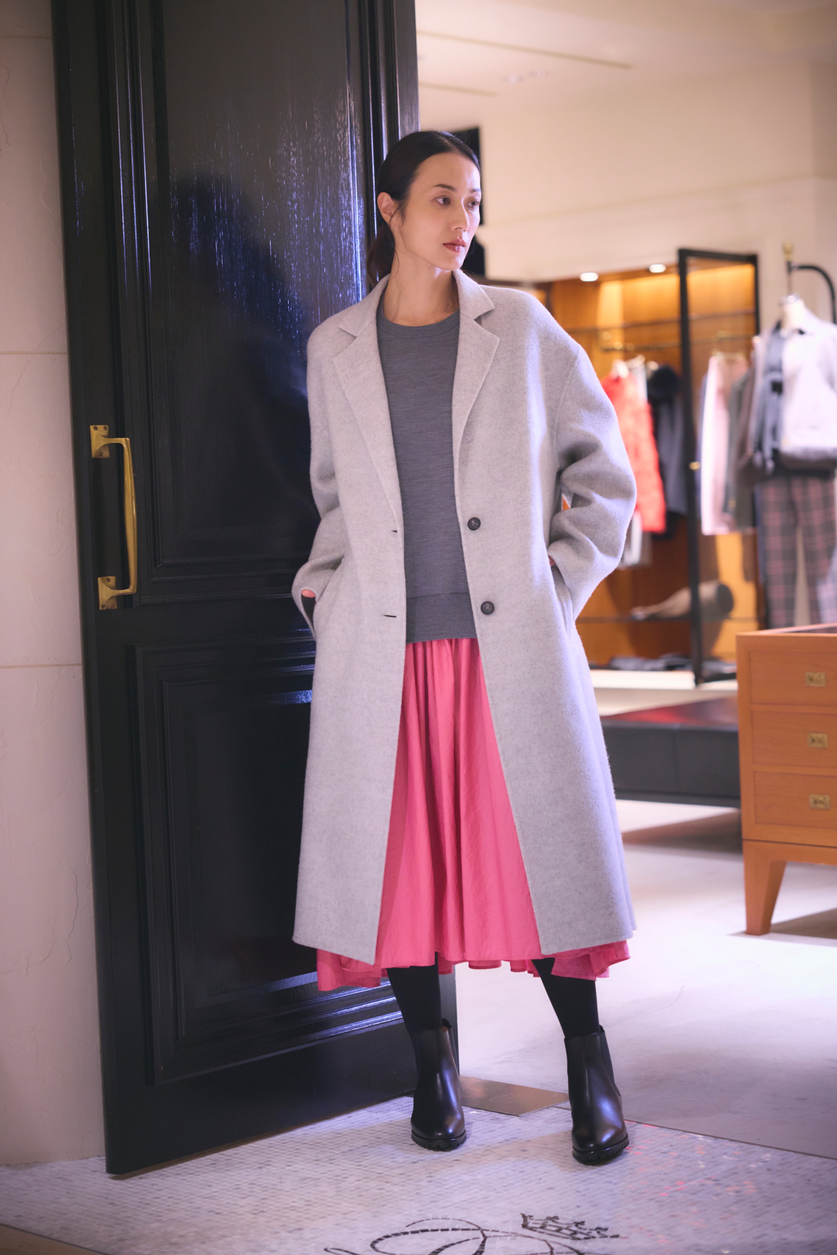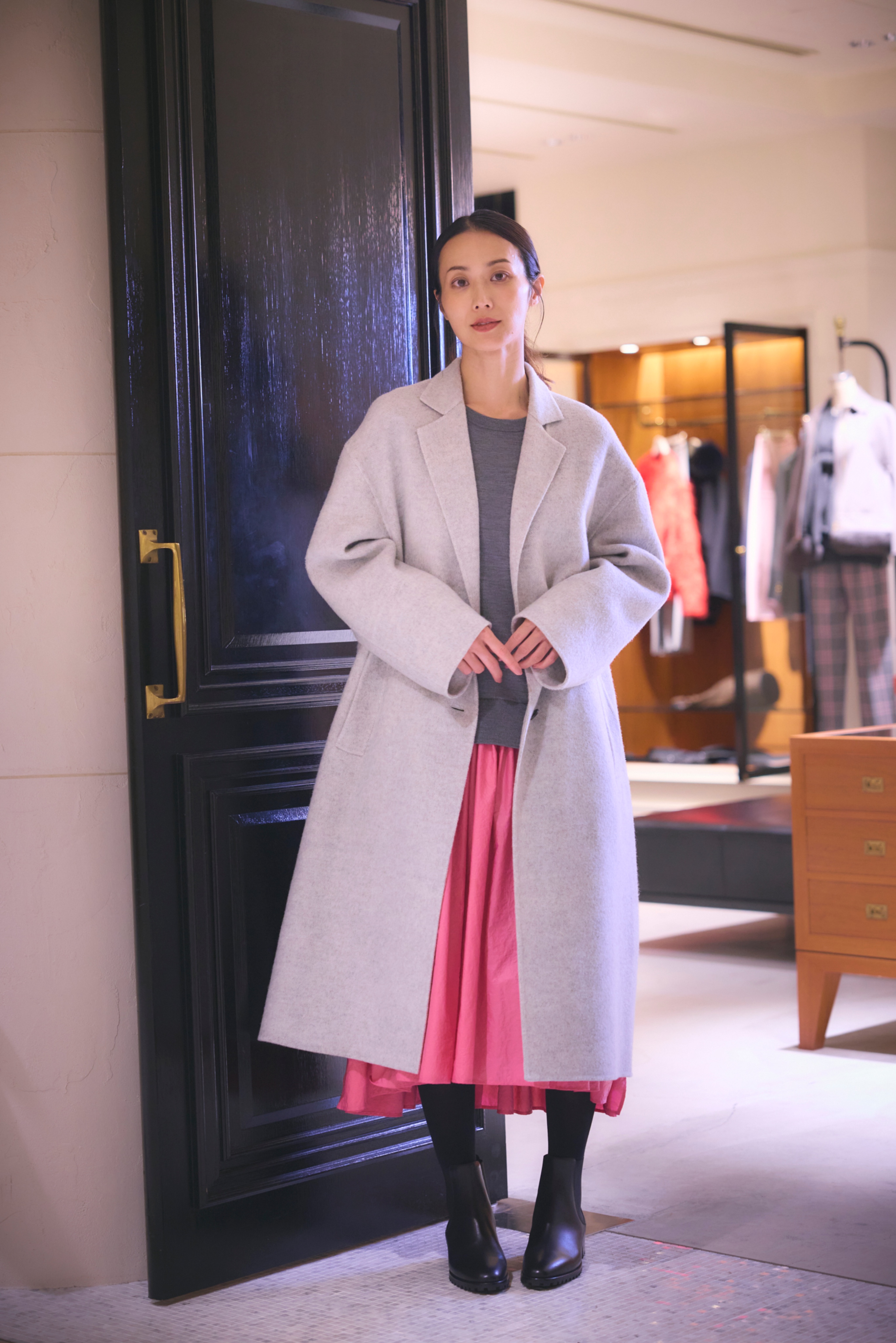 ミニマルなロングストレートスカートとセットアップ可能なトップスと合わせれば、コートを脱いでも、すっきりとしたシルエットに。
