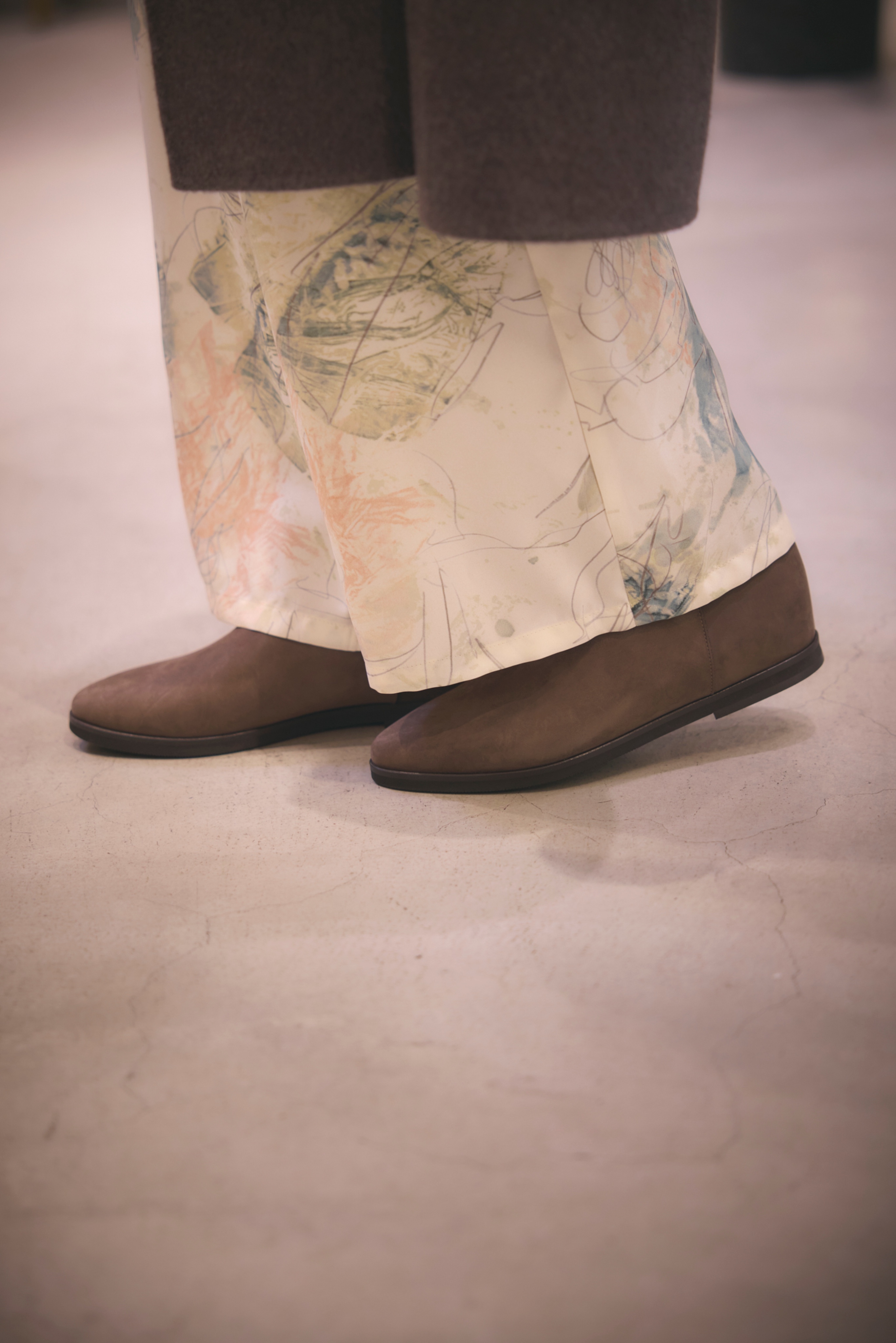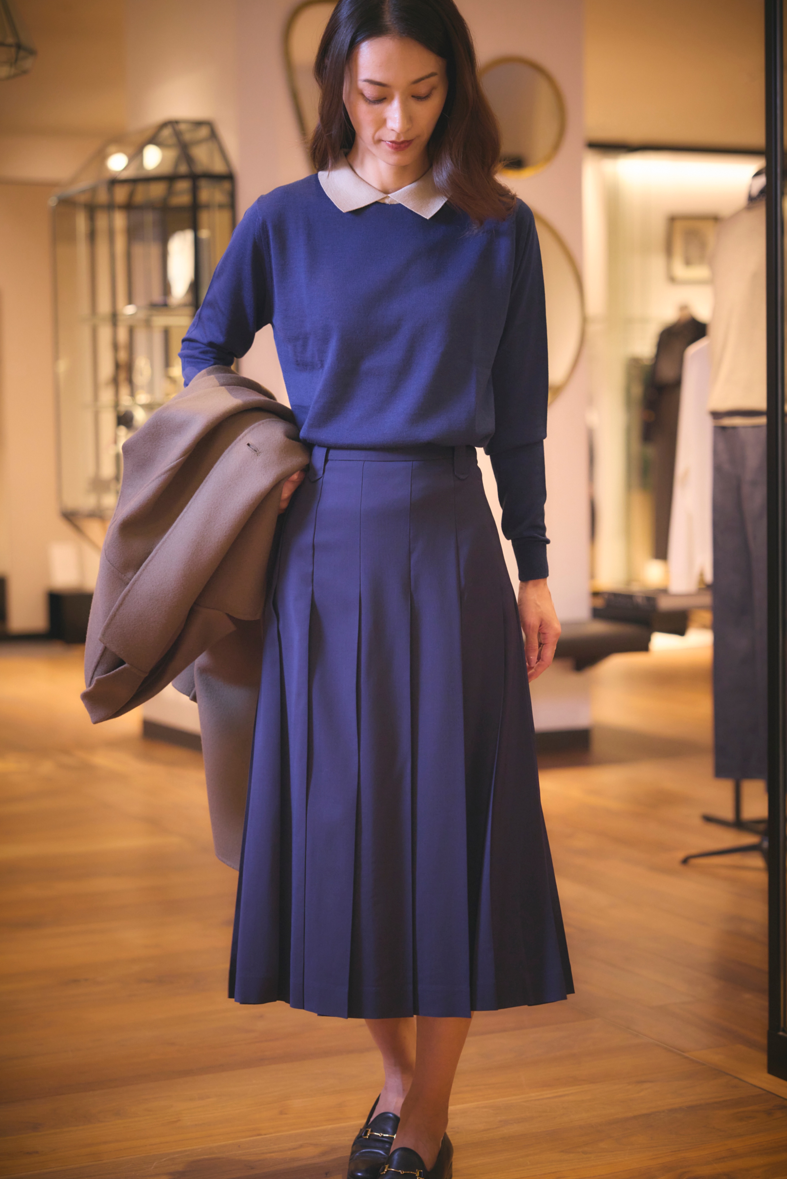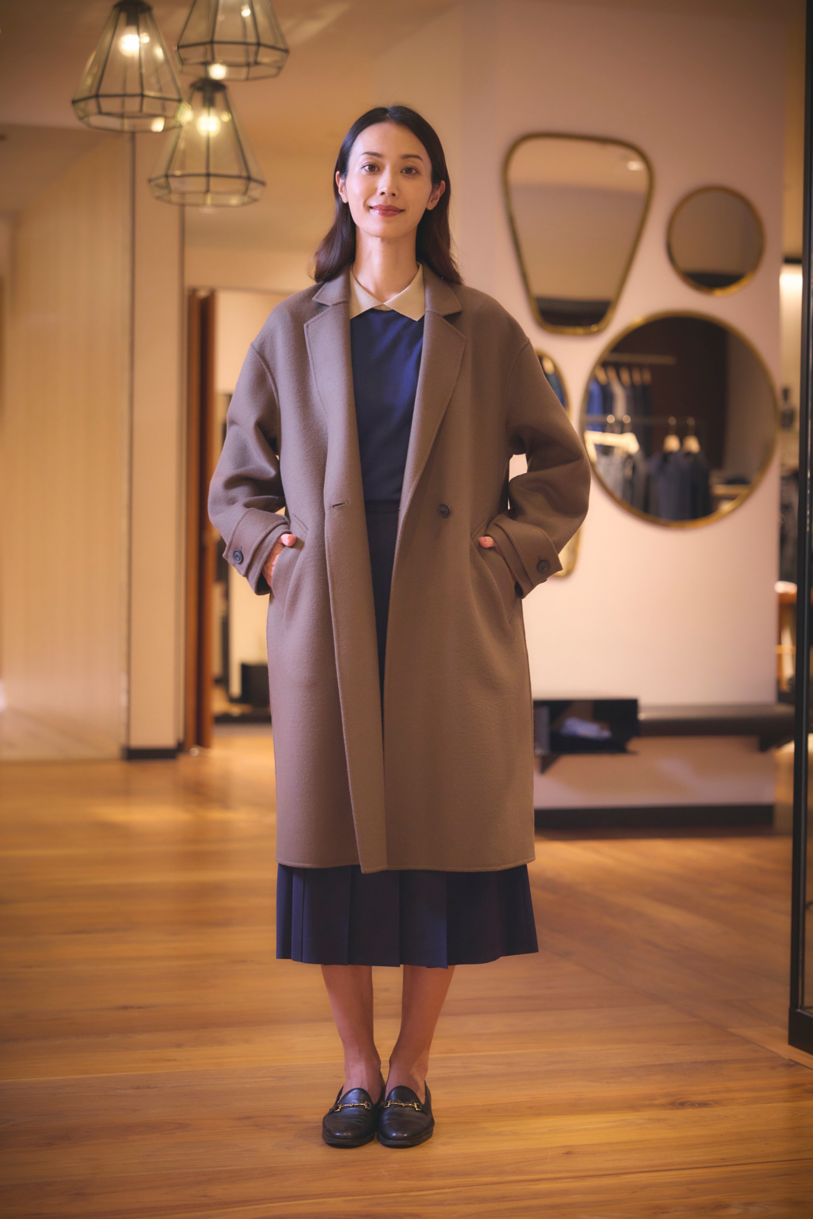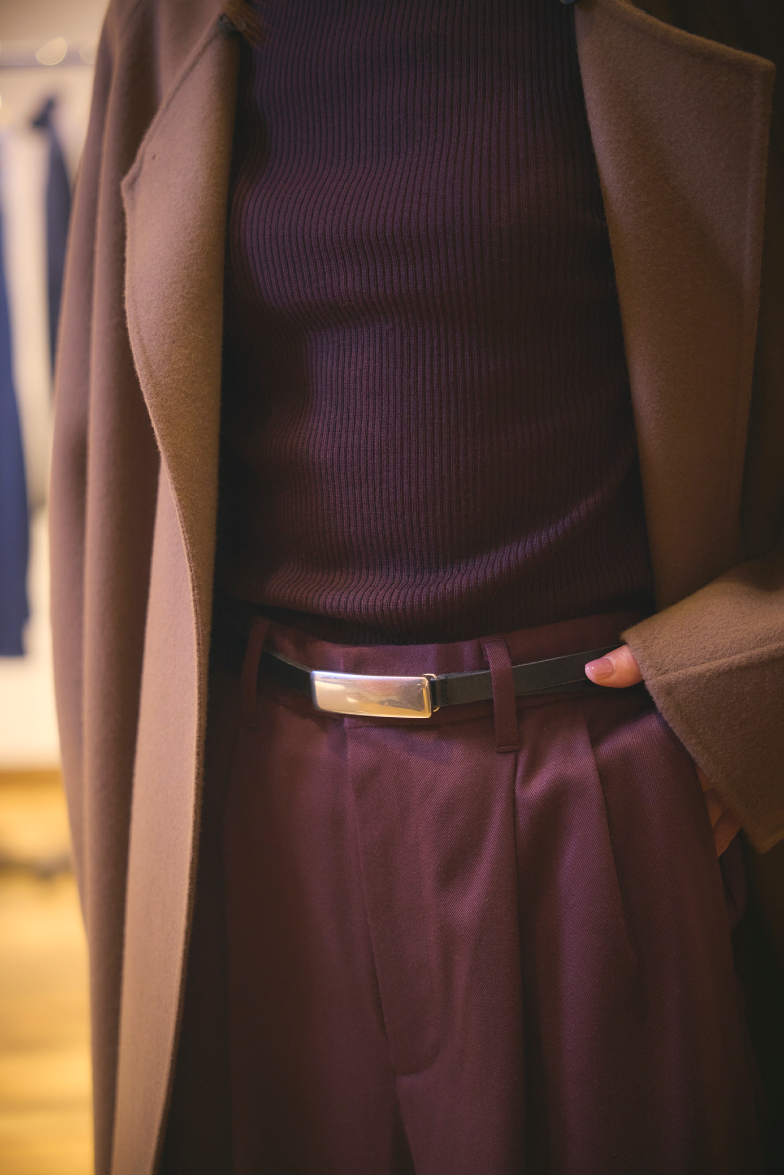 ミニマルなロングストレートスカートとセットアップ可能なトップスと合わせれば、コートを脱いでも、すっきりとしたシルエットに。