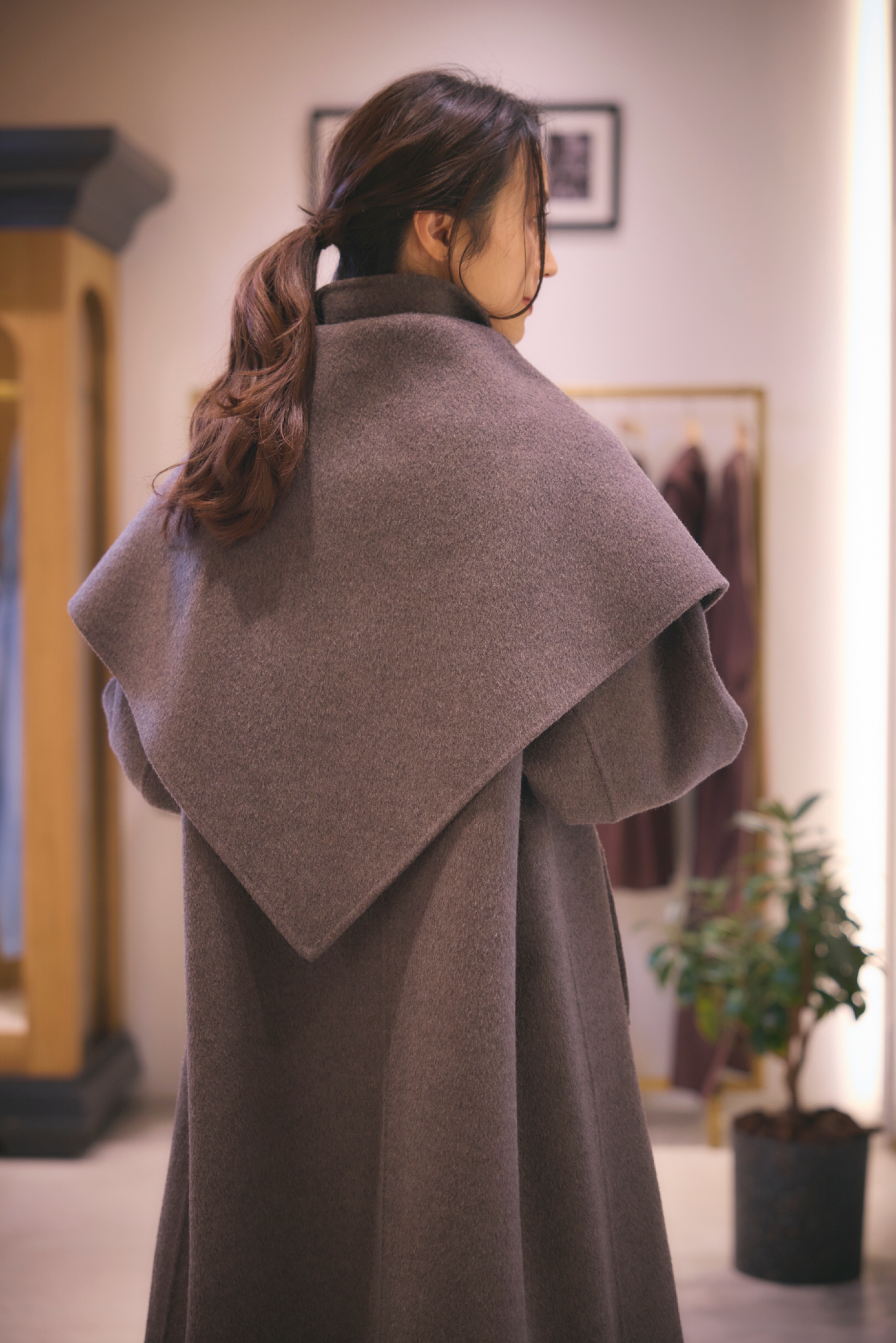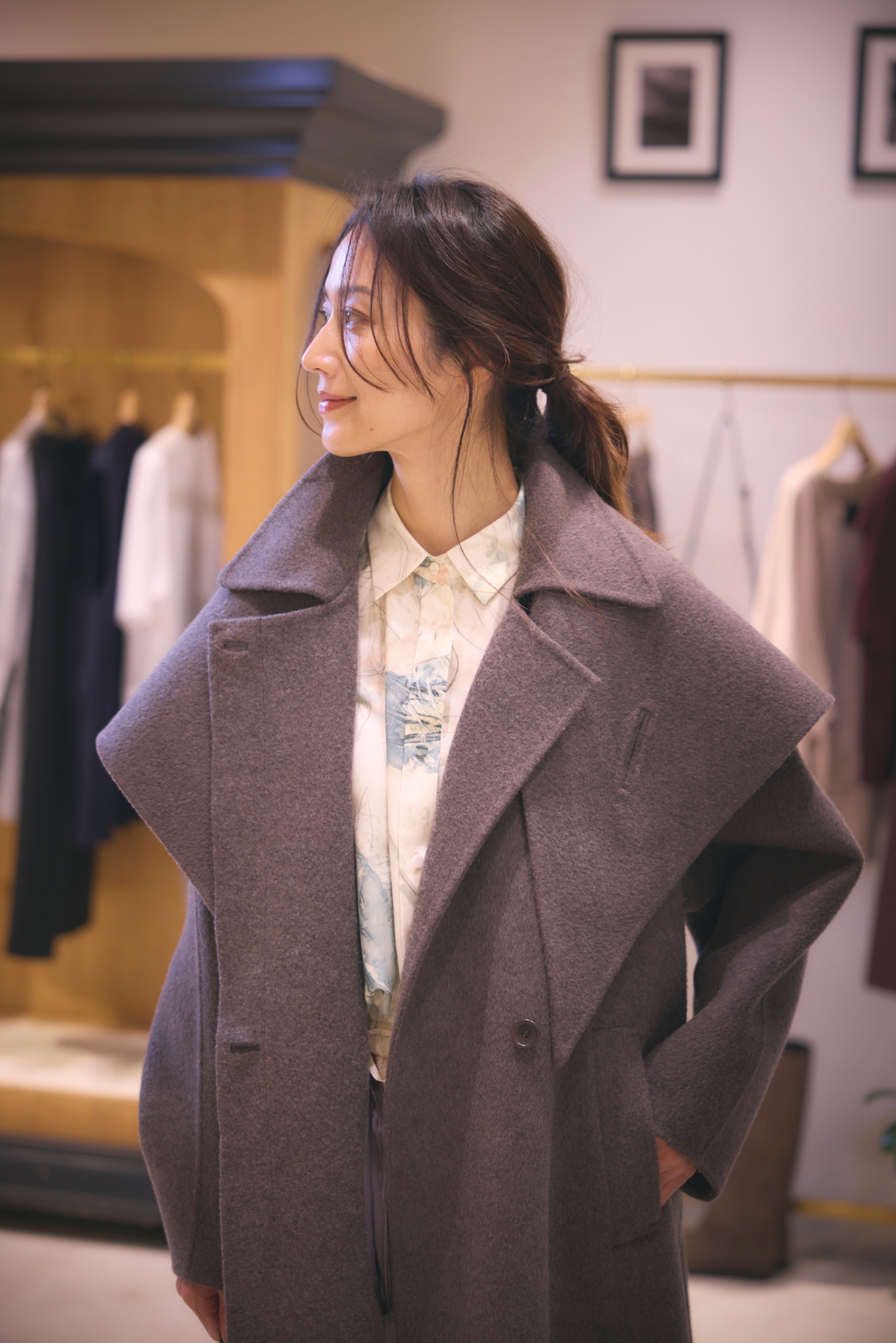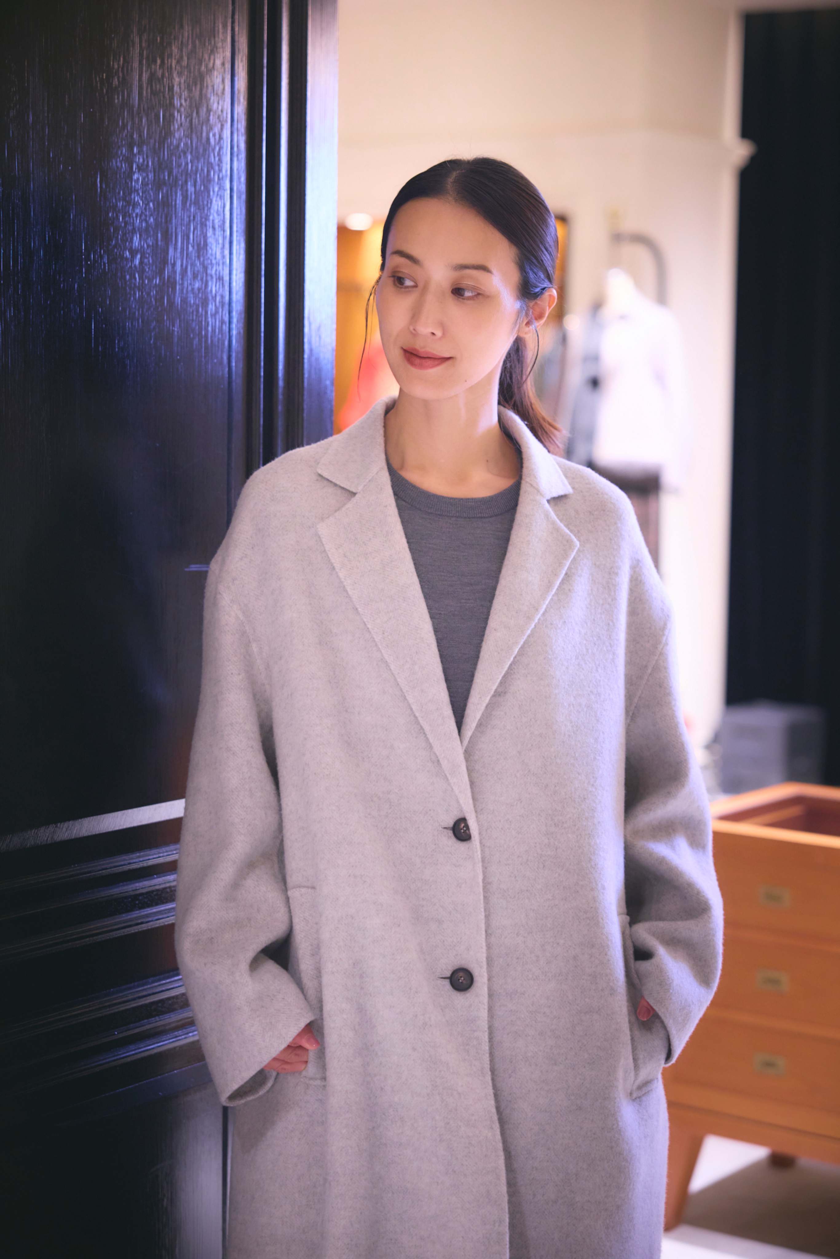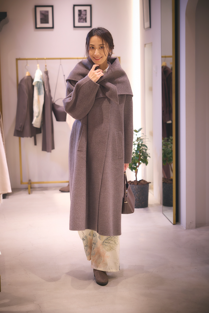 毎年定番のダブルビーバーコートに、艶と膨らみが出る両面シャルム加工を施しました。共布のストールが付いており、首元に巻くだけで顔まわりを華やかに演出。しなやかでありながら温もりのある上質な生地感が魅力。