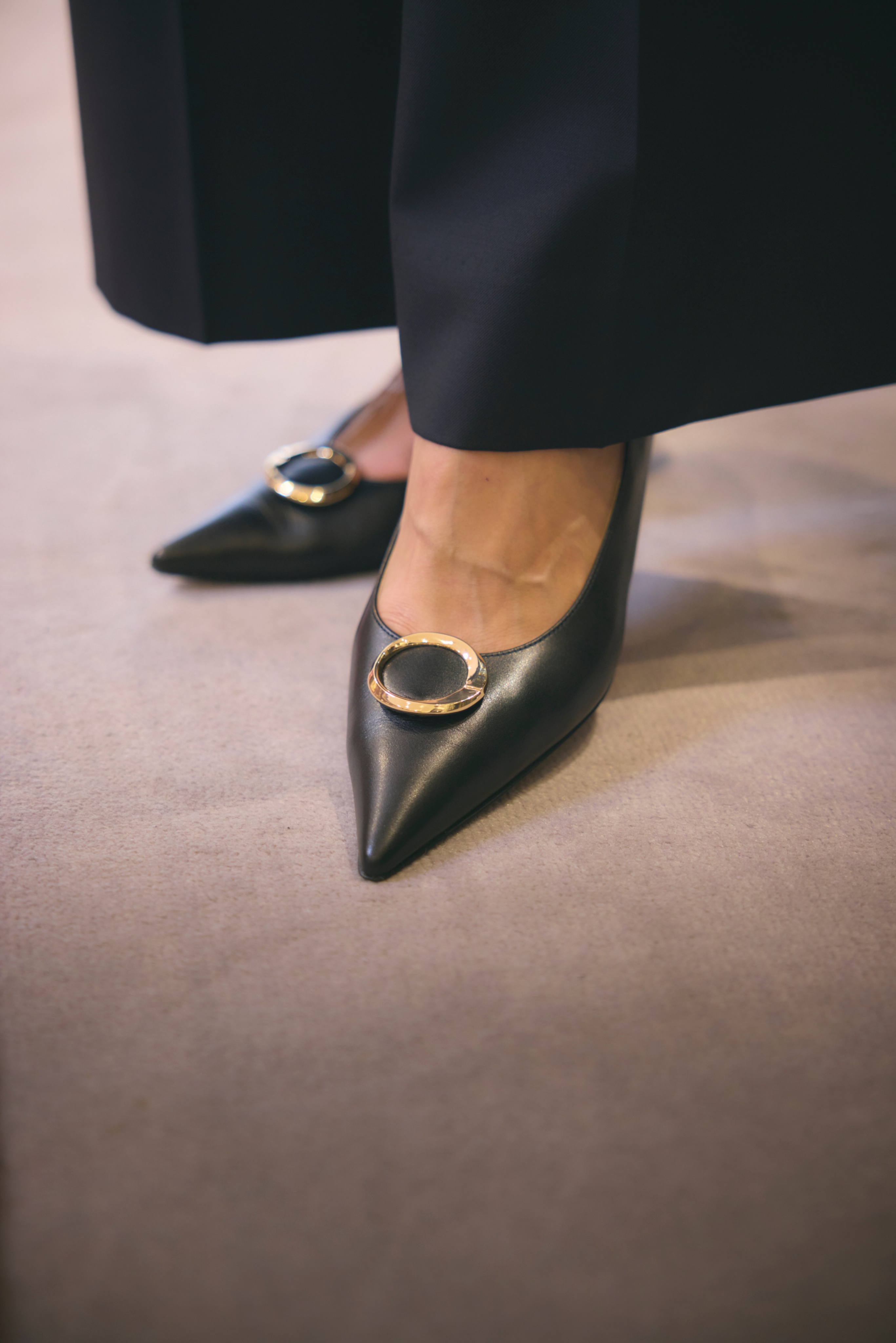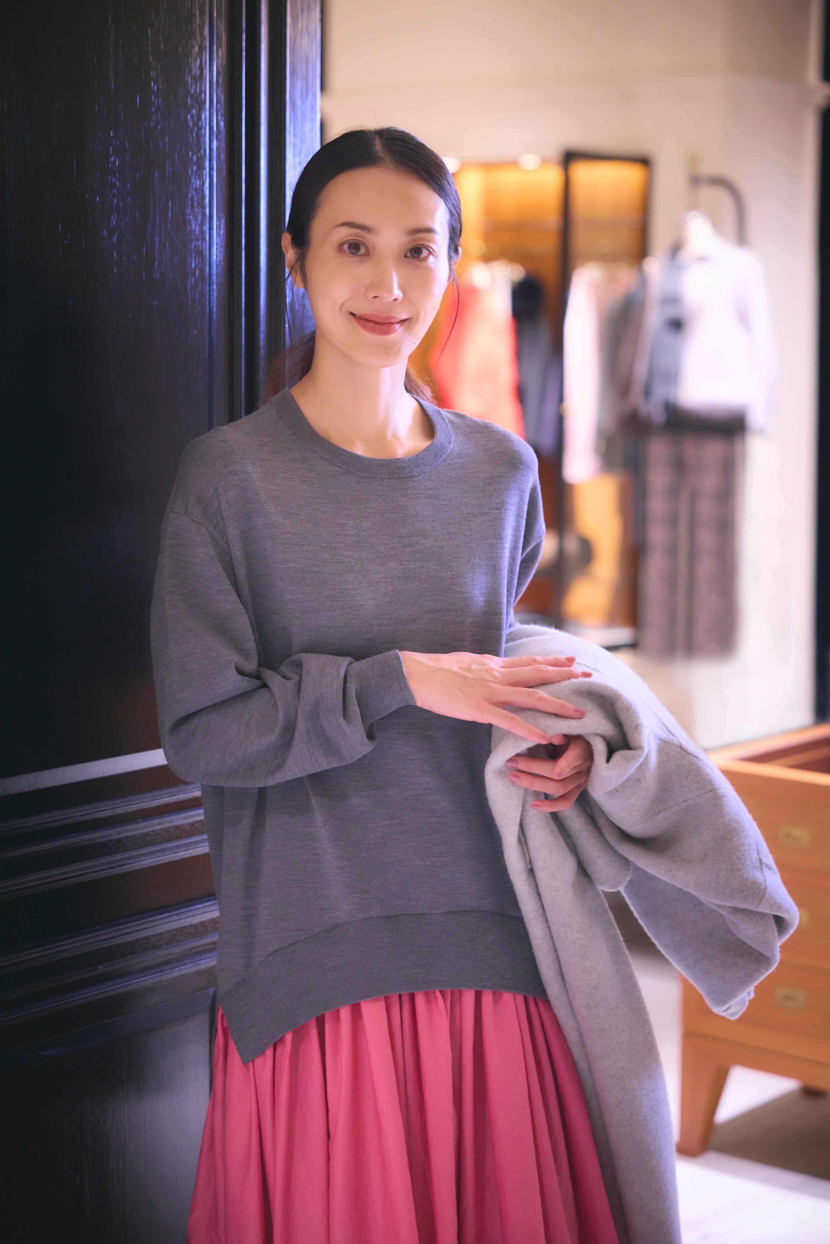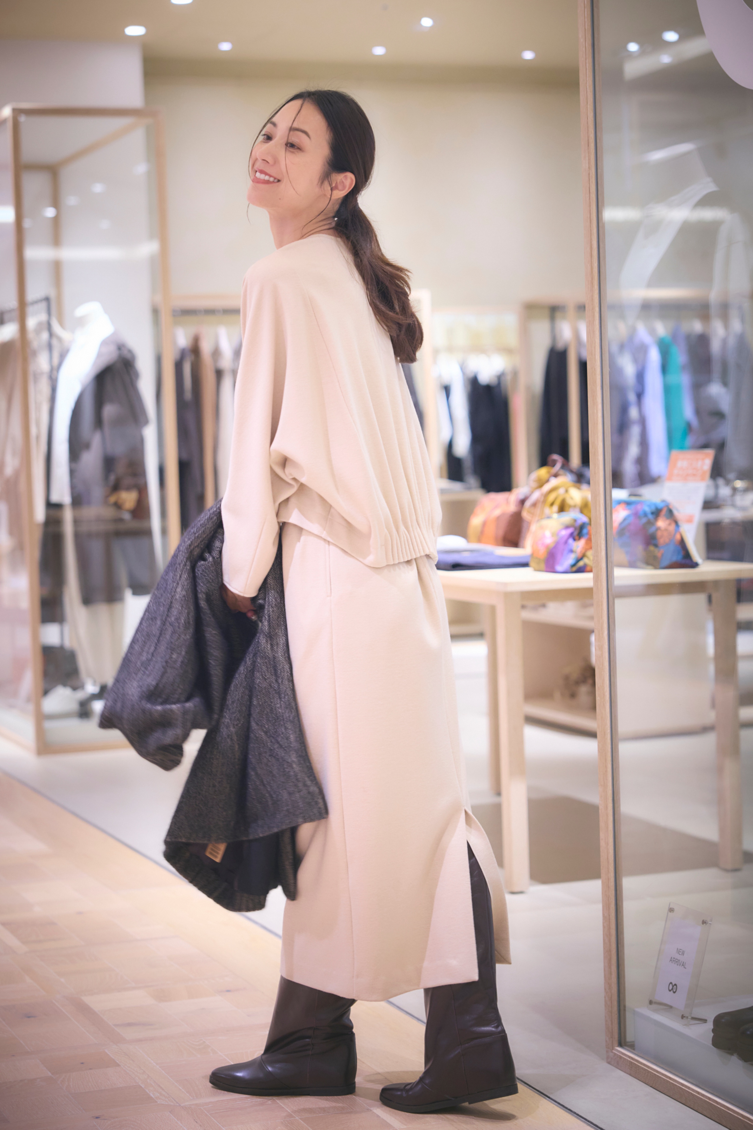 ニットとスカートを組み合わせたドレスが、装いに上品な彩りを添えます。