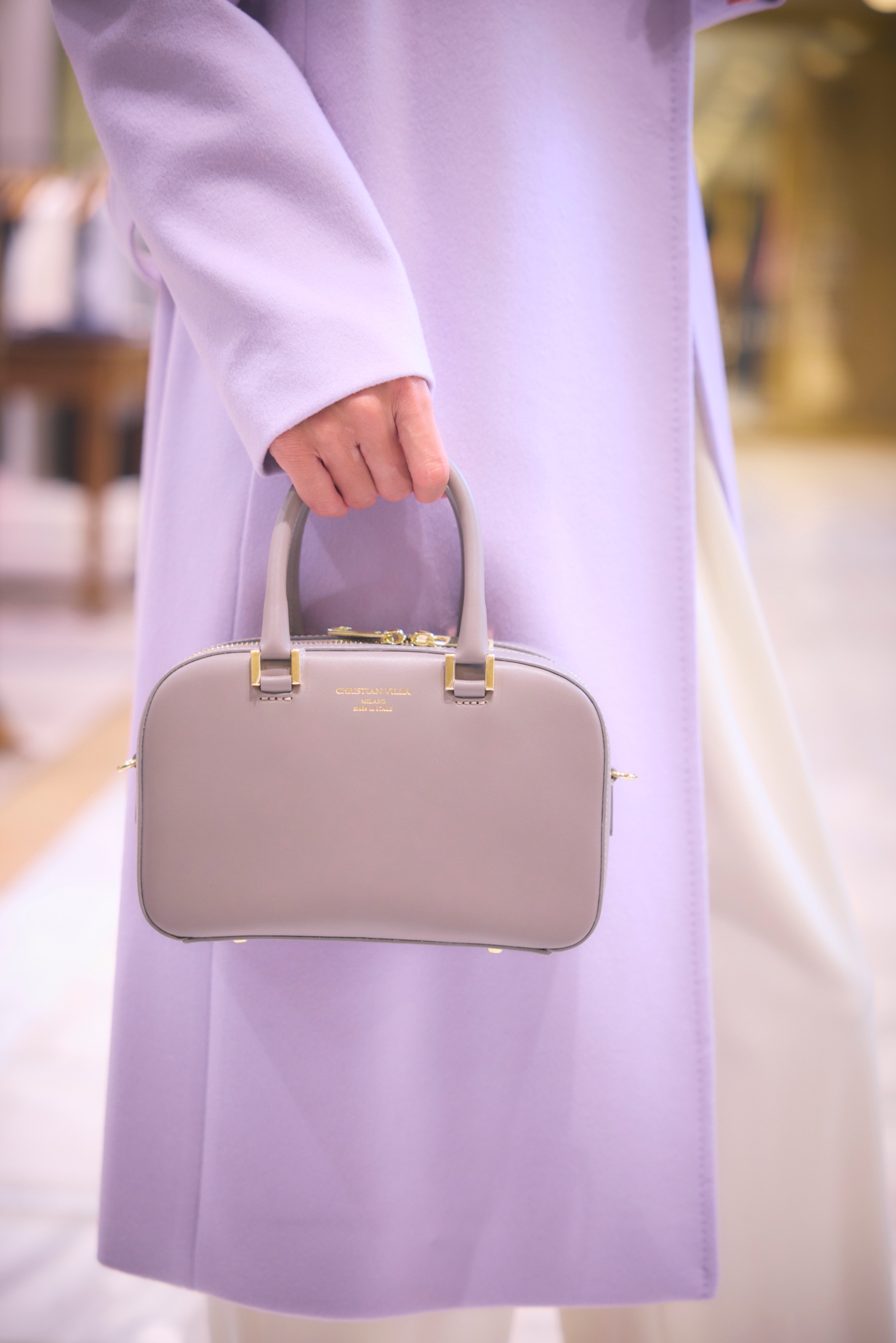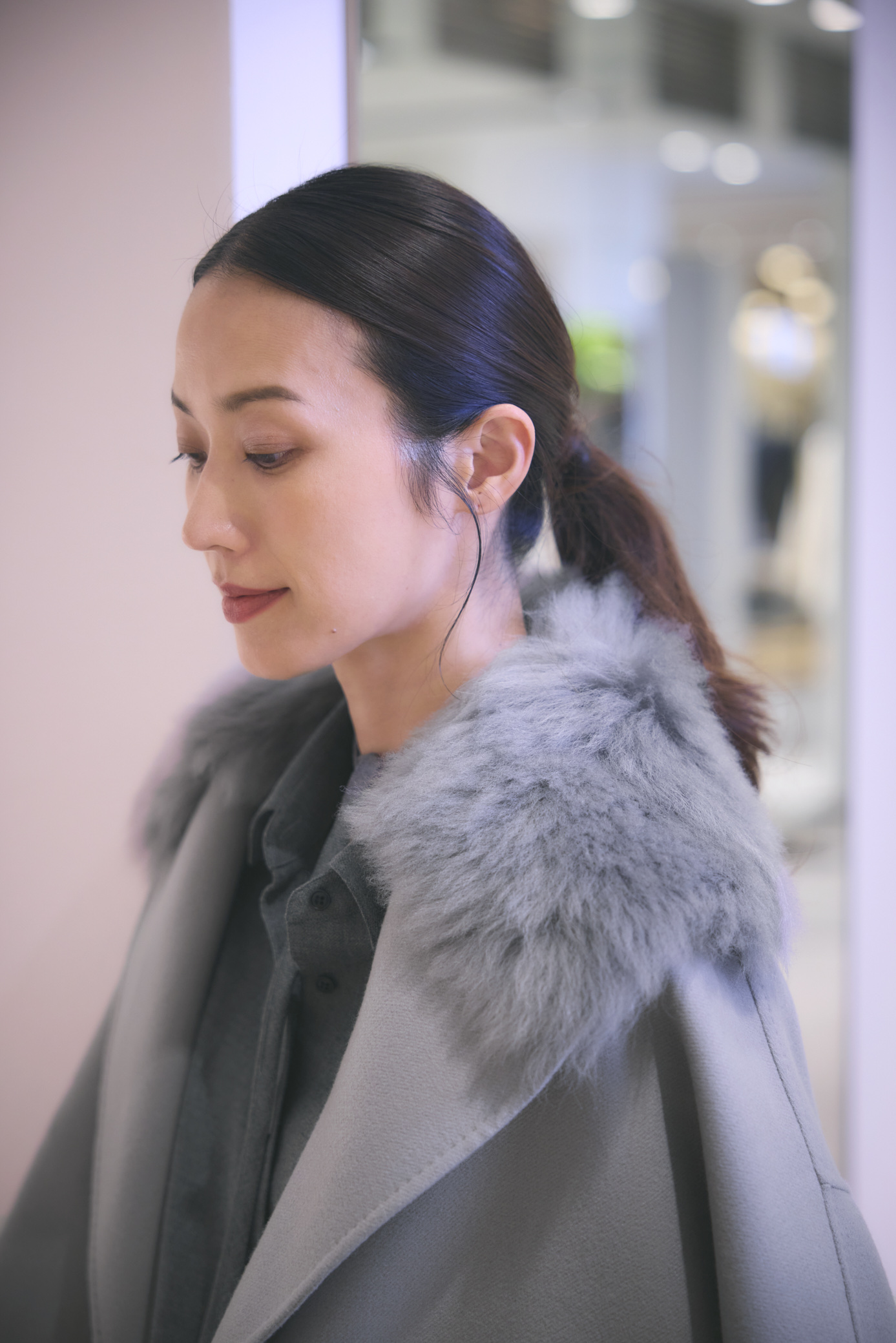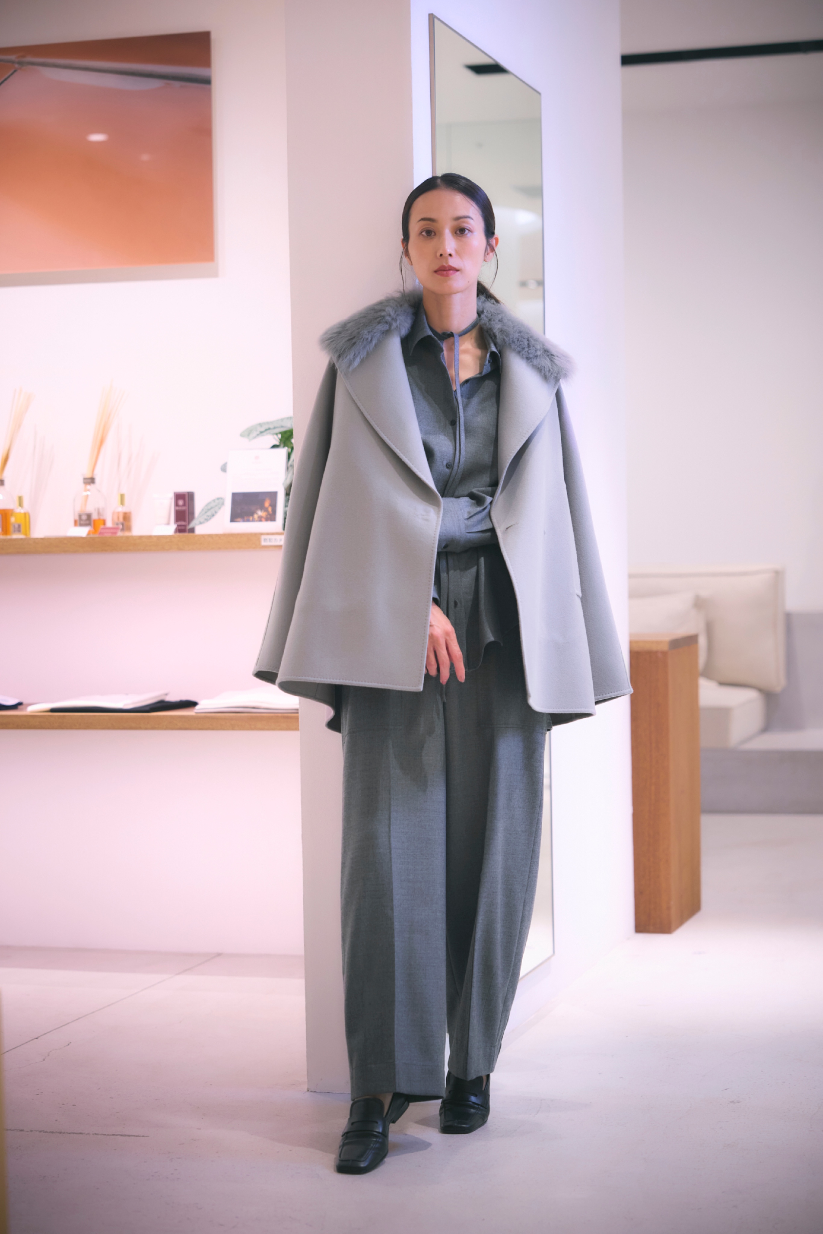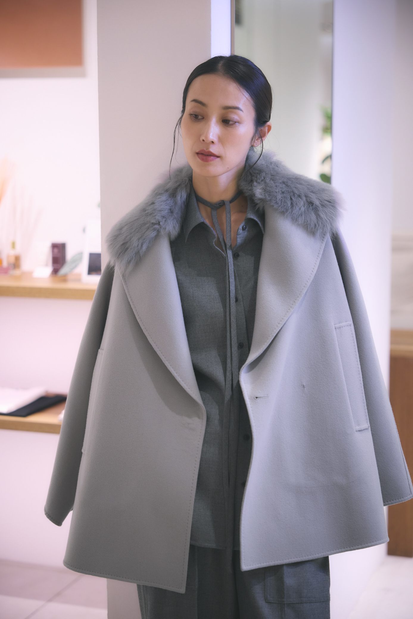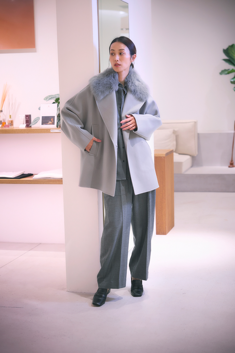 大きなショールカラーに取り外しができるイタリア製のムートンファーをあしらったショートコート。ディテールを削ぎ落としたミニマルなデザインに、抜け感のあるシルエットと上品な華やかさが際立ちます。