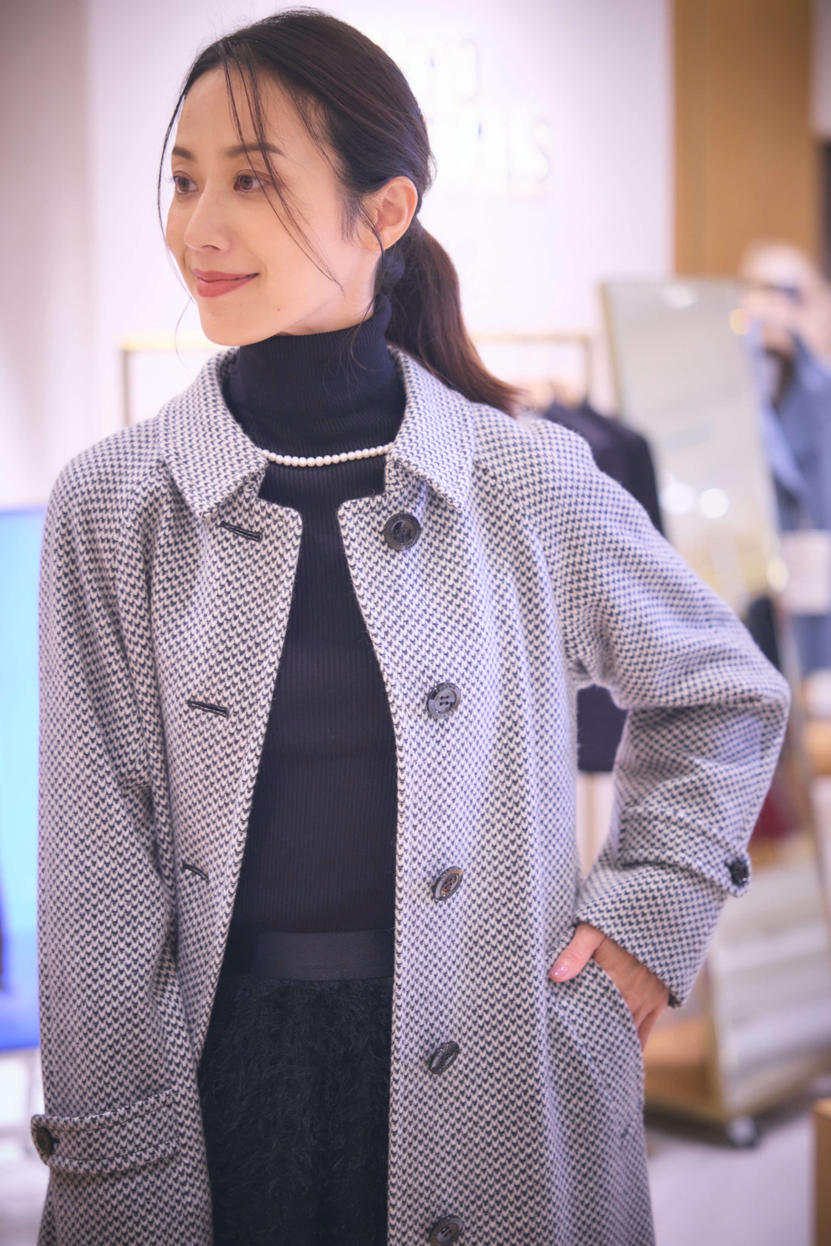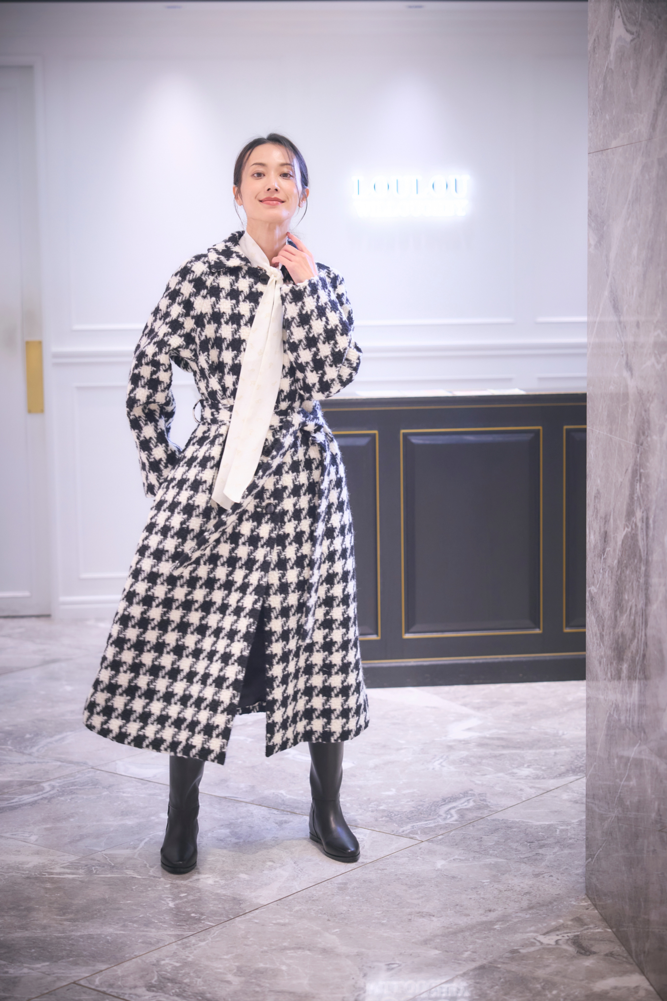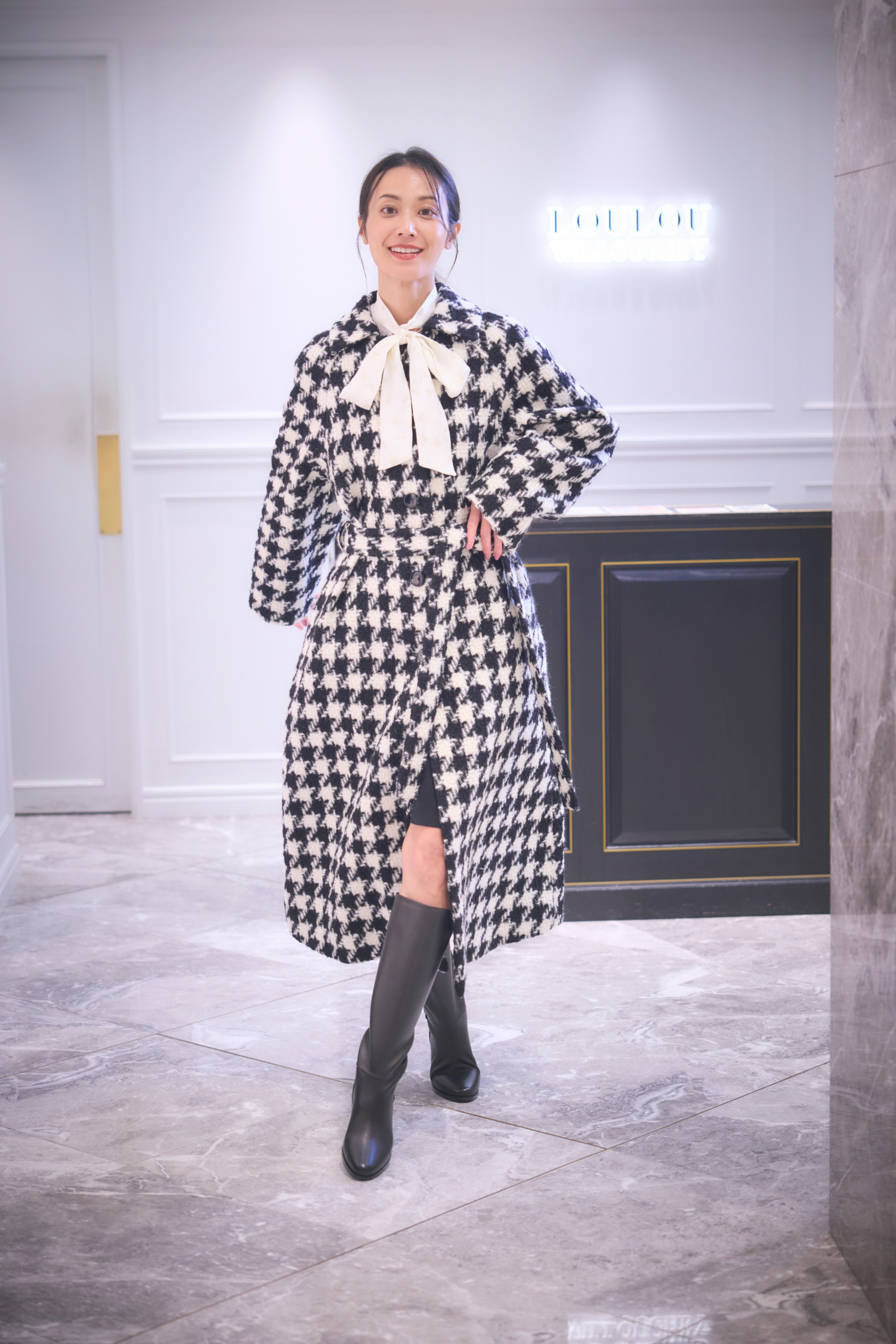 膨らみ感のあるウールの糸を使用して織り上げられたツィーディーな素材。オリジナルで柄を組んで作った千鳥柄が魅力的。ラグランスリーブのオーバーシルエットでかなり太めの袖でゆったりとした印象ですがウエストのリボンで絞っていくと女性らしいメリハリのあるシルエットで着用可能に。