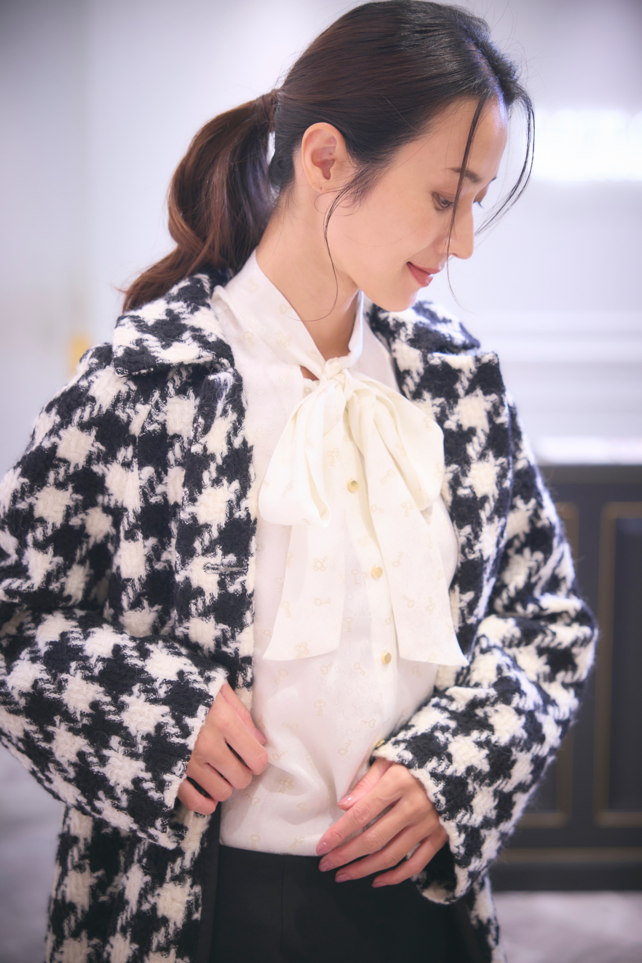 トレンドのステンカラーと大きめのボタンもポイント。トップスのボウタイブラウスをリボンにすると甘さもプラスされてさらに女性らしく。