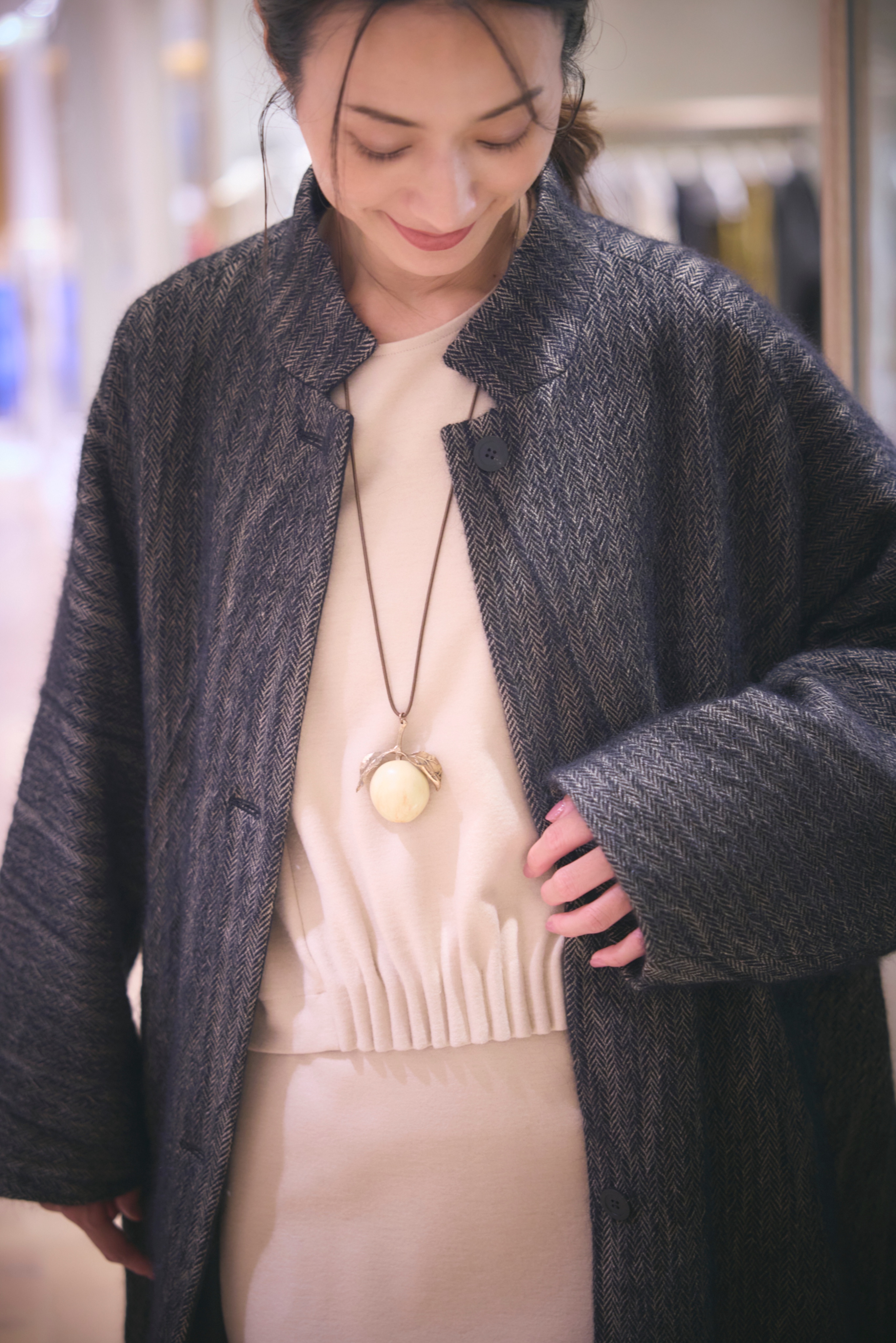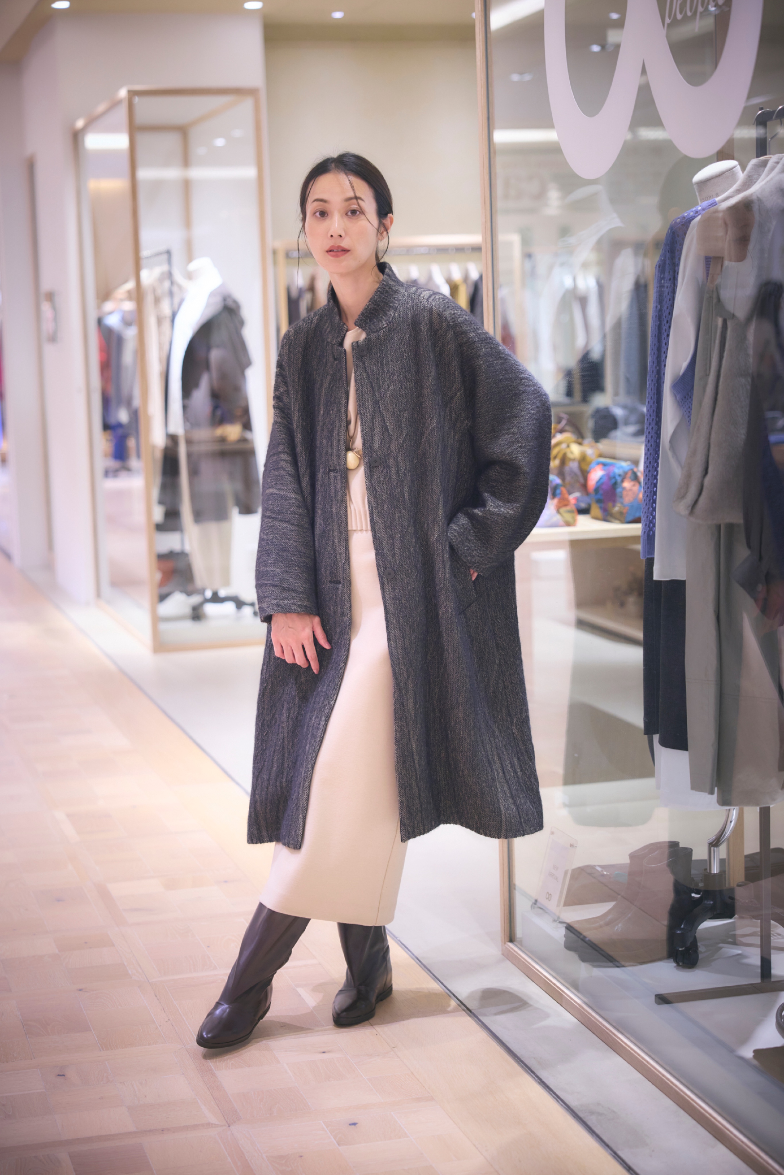 膨らみのあるウールを毛抜き仕立てに、ボリューム感を保ちながらも軽やかに仕上げたコート。起毛をかけたヘリンボーン柄の素材は、メンズライクな表情にやわらかさを添え、羽織るだけで旬のムードを引き寄せます。