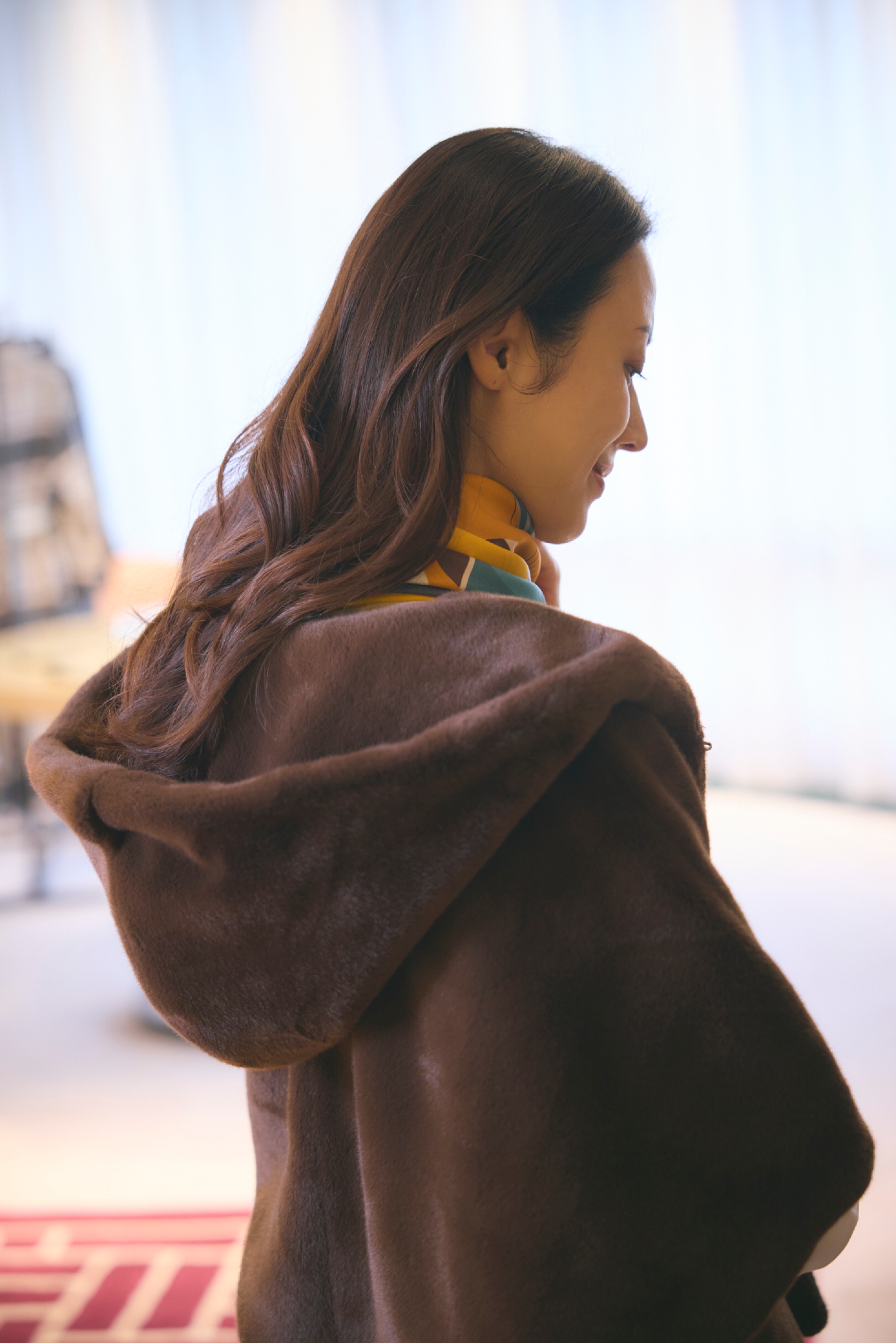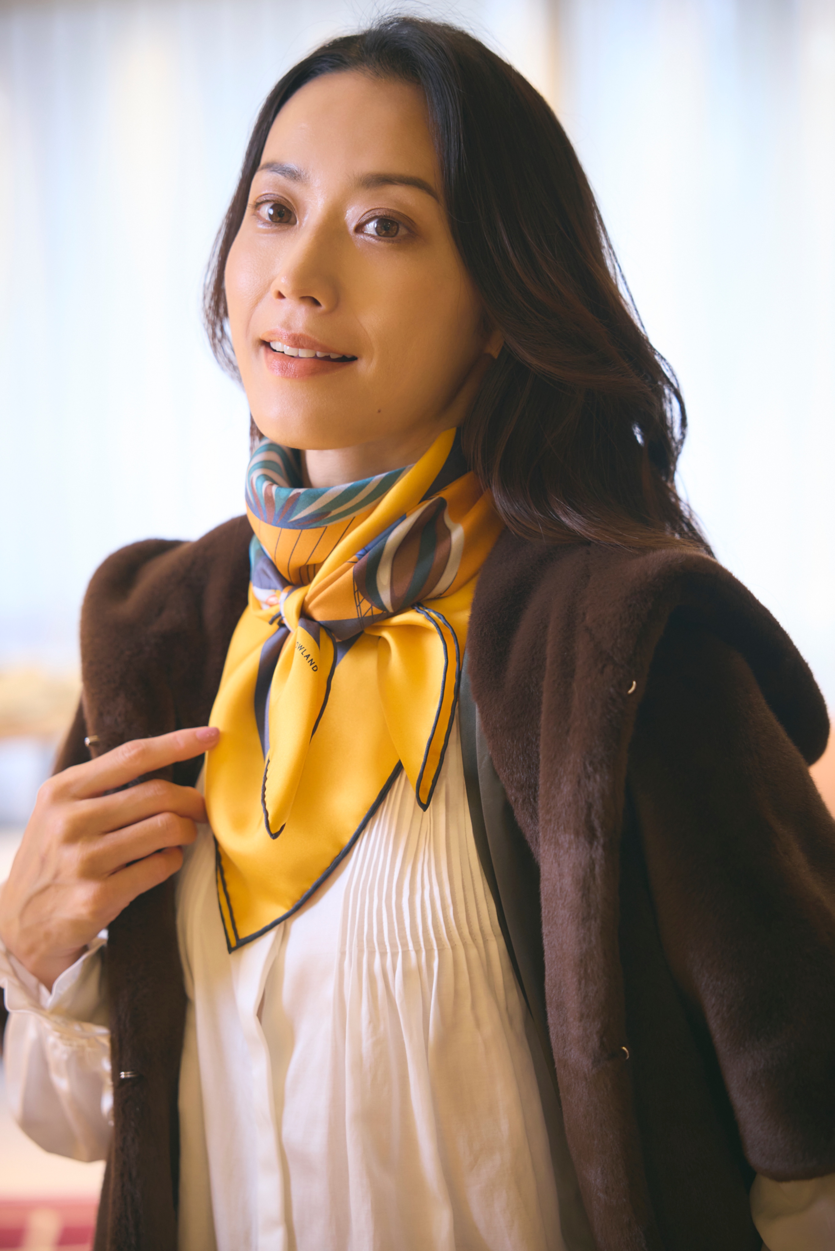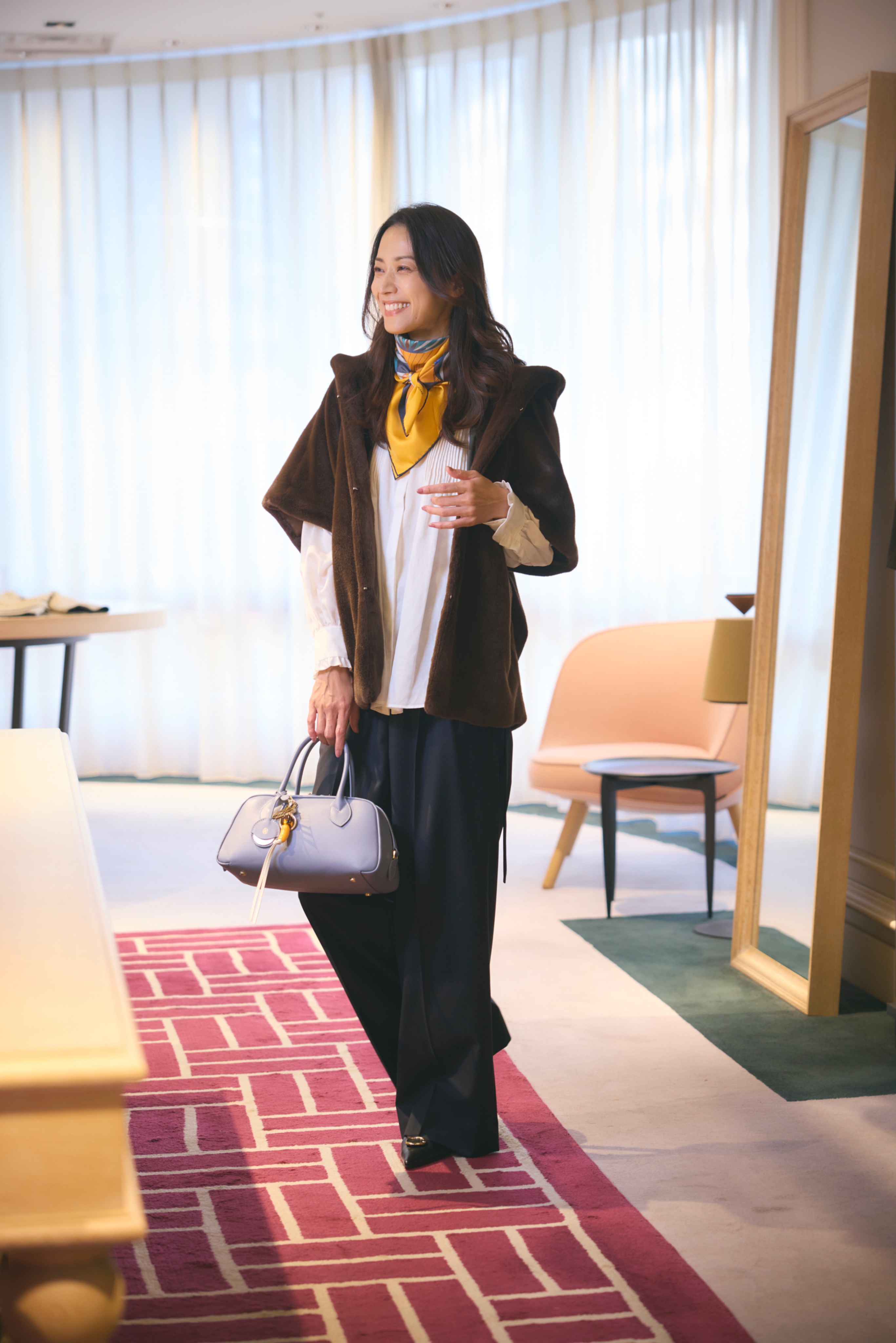 リサイクルポリエステル糸を使用した上質なエコファー素材のアウター。薄手のブラウスから厚手のニットまで合わせやすく、ジレ感覚で羽織ることができます。肘までの袖丈なのでコート未満の時期から着用できるのも嬉しいポイント。さらりとまとうだけで秋冬の気分をグッと高めてくれるアイテム。黄色のスカーフとシューズのメタルパーツがアクセントに。