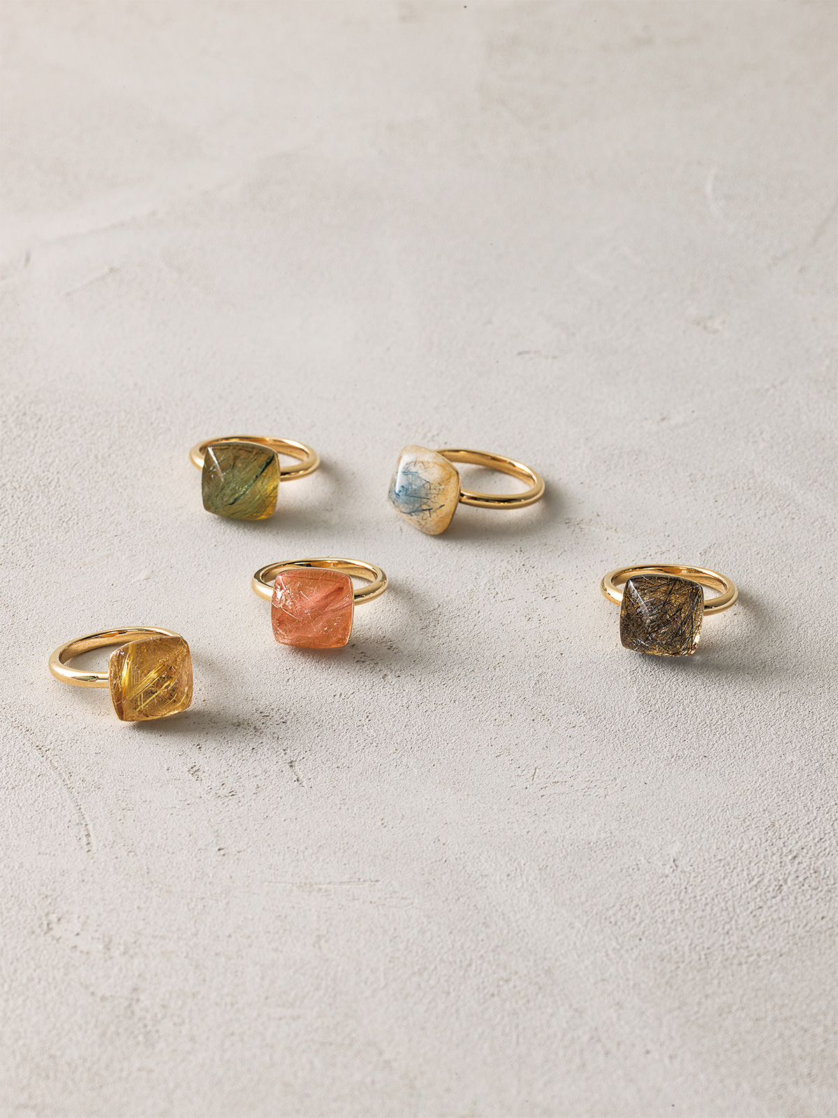 クリアな石の中にカラーインクルージョンの入った珍しいクォーツ。美しい5色のカラーバリエーションをご用意しています。それぞれのカラーやインクルージョンは1点1点異なり、個性豊かな表情が特徴的。お好みのカラーの中から、自分にぴったりの1点をお選びください。