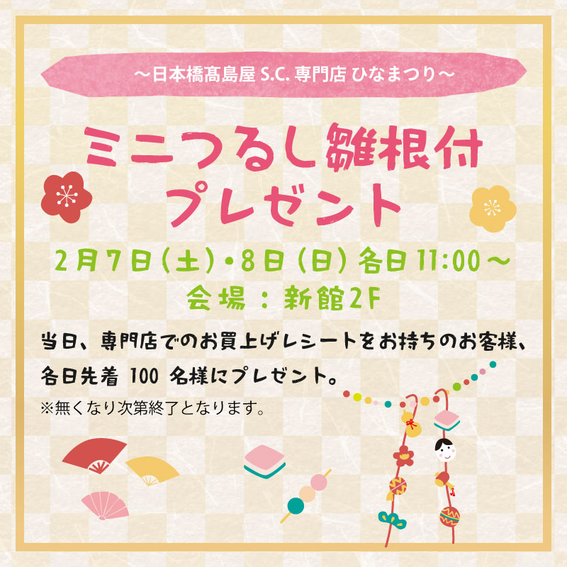 専門店でのお買上げレシートをお持ちのお客様、各日先着100名様に「ミニつるし雛根付」をプレゼントいたします。