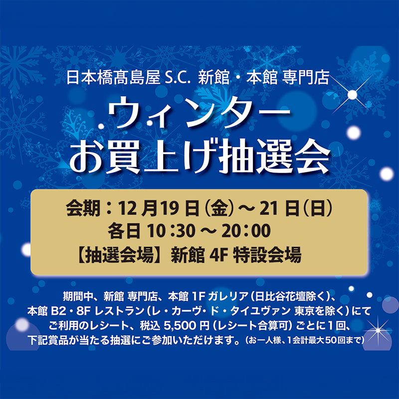 期間中、新館 専門店、本館1F ガレリア(日比谷花壇除く)、本館 B2・8F レストラン(レ・カーヴ・ド・タイユヴァン 東京を除く)にてご利用のレシート、税込5,500円(レシート合算可)ごとに1回、下記賞品が当たる抽選にご参加いただけます。(お一人様、1会計最大50回まで)