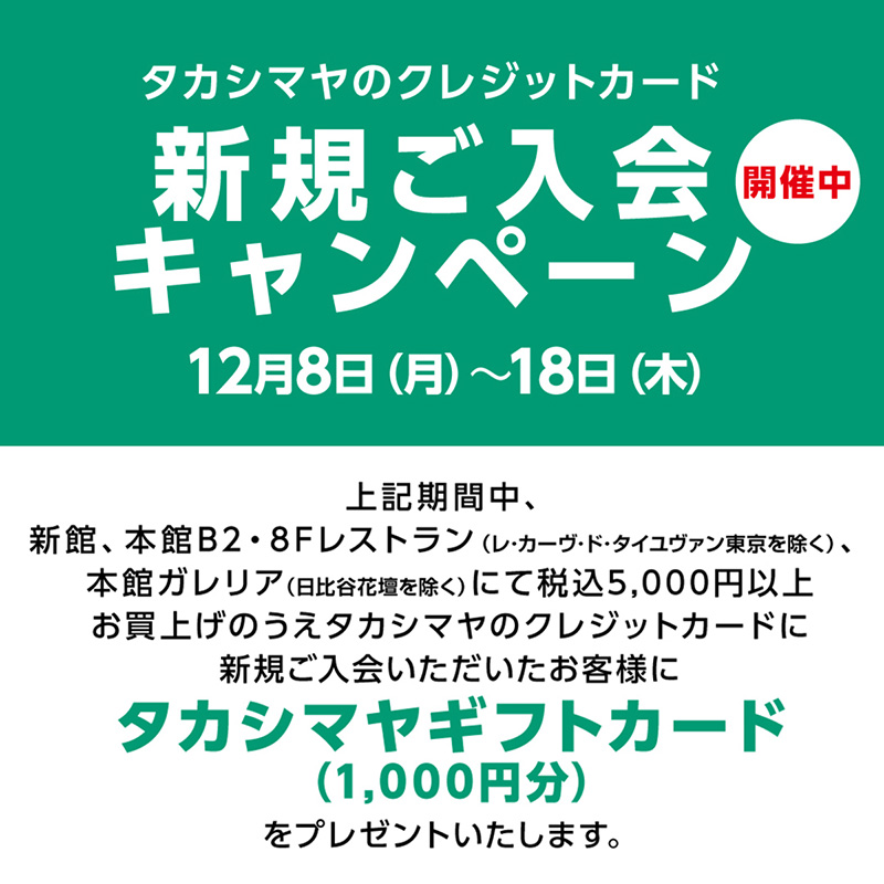 期間中、新館、本館B2・8Fレストラン(レ・カーヴ・ド・タイユヴァン 東京を除く)、本館ガレリア(日比谷花壇を除く)にて税込5,000円以上お買上げのうえ、タカシマヤのクレジットカードに新規ご入会いただいたお客様にタカシマヤギフトカード(1,000円分)をプレゼントいたします。