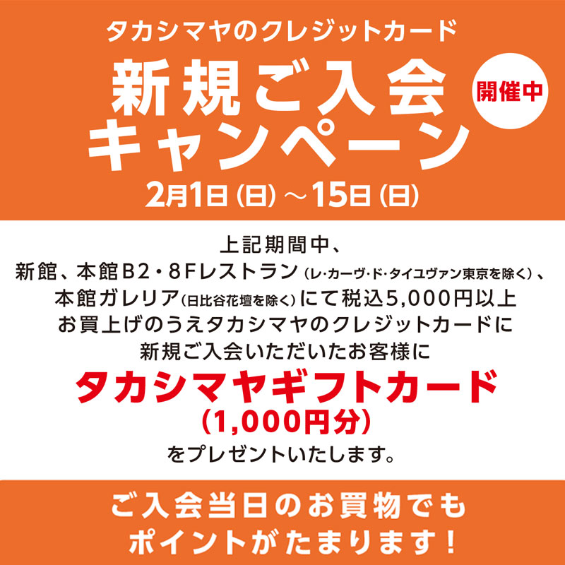 新館、本館B2・8Fレストラン(レ・カーヴ・ド・タイユヴァン 東京を除く)、本館ガレリア(日比谷花壇を除く)にて税込5,000円以上お買上げのうえ、タカシマヤのクレジットカードに新規ご入会いただいたお客様にタカシマヤギフトカード(1,000円分)をプレゼントいたします。