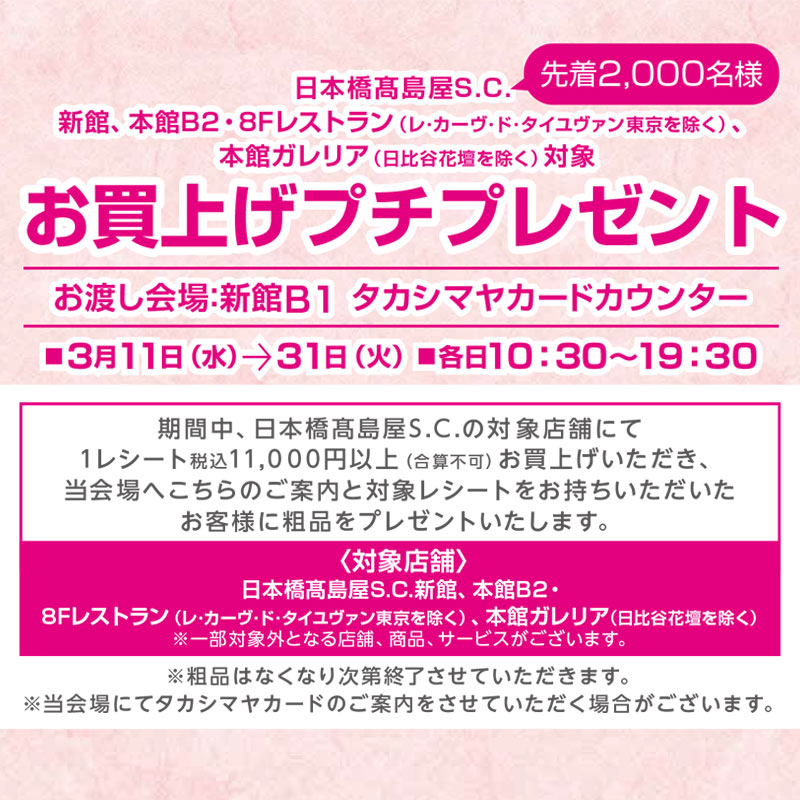 期間中、日本橋高島屋S.C.の対象店舗にて1レシート税込11,000円以上(合算不可)お買上げいただき、会場へ対象レシートをお持ちいただいたお客様に粗品(除菌ウエットシート1個)をプレゼントいたします。