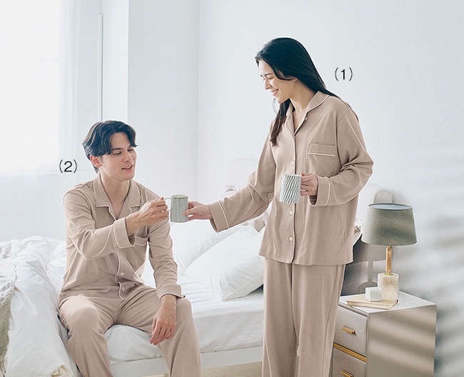 “眠る時間を、夢の時間に”。「動きのここちよさ」「温度のここちよさ」「肌へのここちよさ」を考え、なめらかでやわらかい着ごこちに。上質な風合いのスムース素材使用。