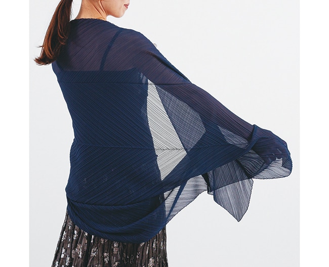 軽やかな透け感のある生地にプリーツ加工を施した「着るストール」。袖を通して羽織りとして、首に巻いてストールとしても使えます。