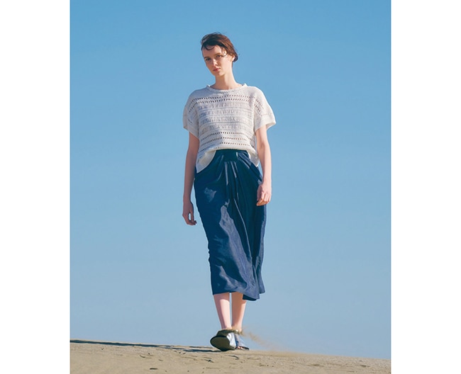 初夏の風を肌で感じるレーシーなトップス。機械織りと手作業でレース調に仕上げた技ありニット。ドレープの効いたスカートと合わせて・・・・。