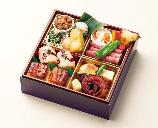 赤飯やローストビーフ、たこ柔らか煮など、彩リ華やかに盛り付けました。母の日限定のお弁当です。