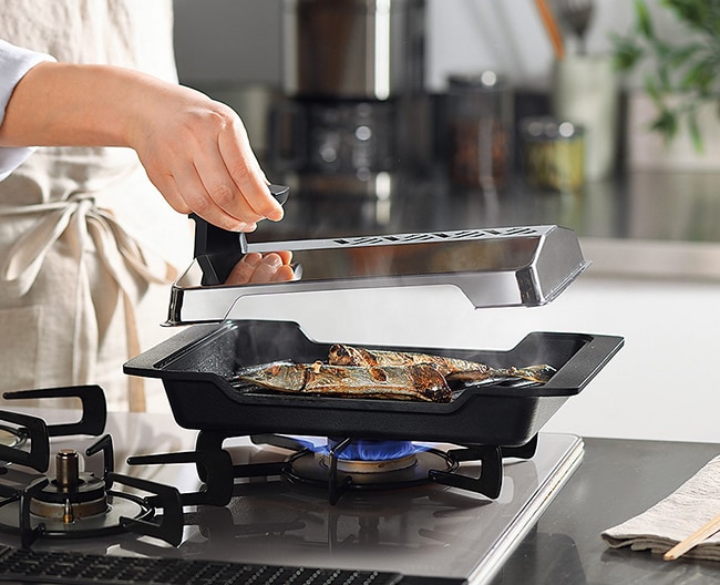 七輪で焼いたように仕上げる新タイプの魚焼き器。炭プレートの遠赤外線効果と独自形状の蓋との組み合わせで中はふっくら、皮はパリッと。