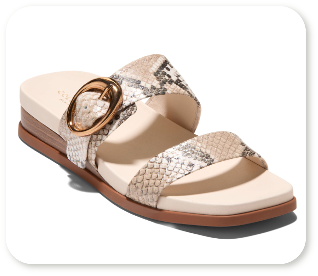 フラットで心地よい履き心地。ゴールドのバックルがラフになりすぎず、品よく華やかに大人の足元を演出するスライドサンダルです。
