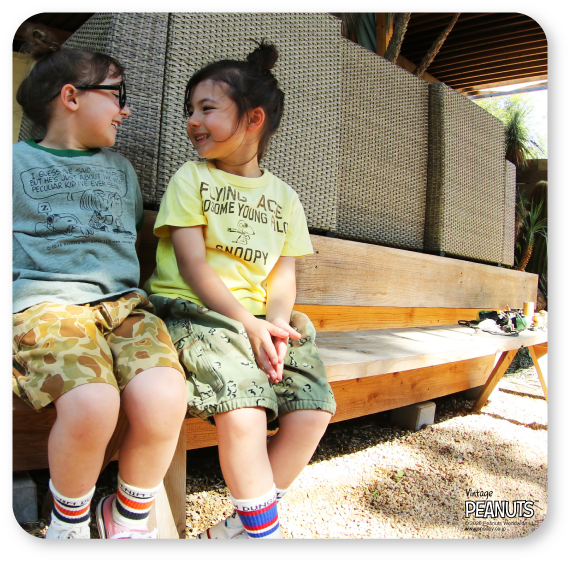 カモ柄のショートパンツは男女ともにかっこよくはいていただけます。楽しいコーディネートでゴールデンウィークのおでかけにぴったりです。