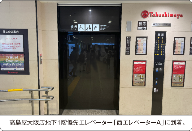 左側にある上りスロープを20m直進、左手すぐに高島屋大阪店地下1階 優先エレベーター「西エレベーターA」がございます。