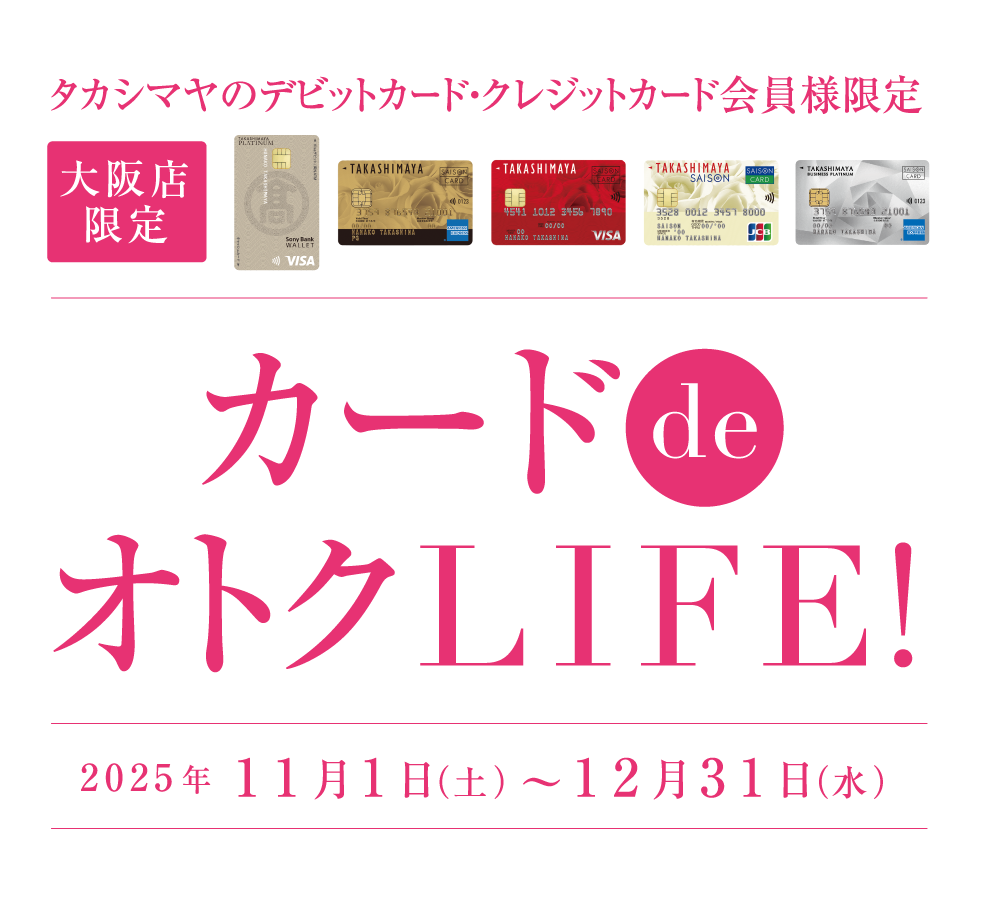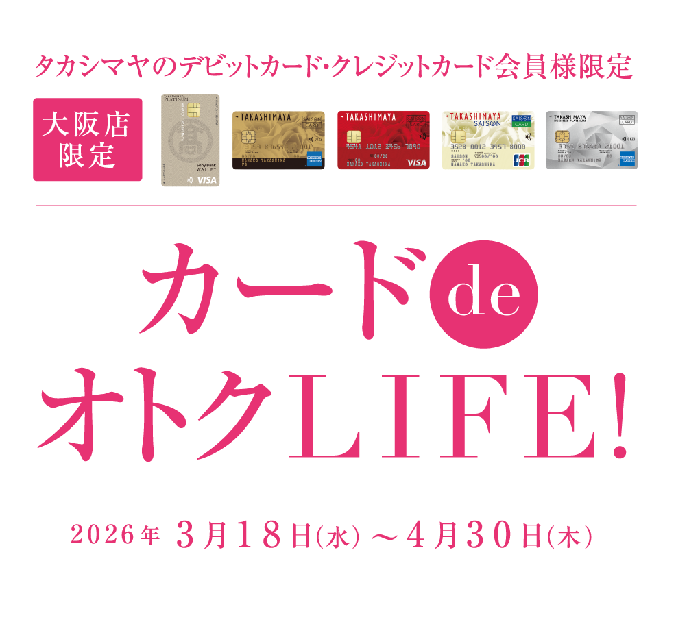 ●「カードdeオトクLIFE!」の優待サービスは「タカシマヤのデビットカード・クレジットカード」のご利用、ご提示のみとさせていただきます。●タカシマヤの各クレジットカードご入会当日からご利用いただけます。●タカシマヤのクレジットカードで優待価格商品をご購入の際は、「クレジット決済ポイント1%」のポイントサービス対象となります(割引サービスは対象除外となります)。カードによりポイント率の異なるお支払い方法がございます。●現金、商品券等によるご入金分はポイント付与対象外となります。●他の優待との併用はできません。●開催期間以前や期間中のご予約・お取り置き商品は、対象外とさせていただきます。●ご進物体裁をご遠慮いただく場合がございます。●特価品は対象外になります。●一部商品の入荷遅れ・生産中止や催し・イベント等が変更、中止となる場合がございます。●商品のご利用方法により税率が変更となる場合がございます。●価格は予告なく変更になる場合がございます。●価格は消費税を含む総額にて表示しています。