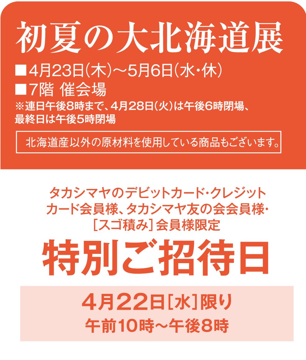 期間中、「タカシマヤのデビットカード・クレジットカード」、「タカシマヤ友の会会員証・お買物カード」、[スゴ積み]にてお支払いいただくと本体価格から