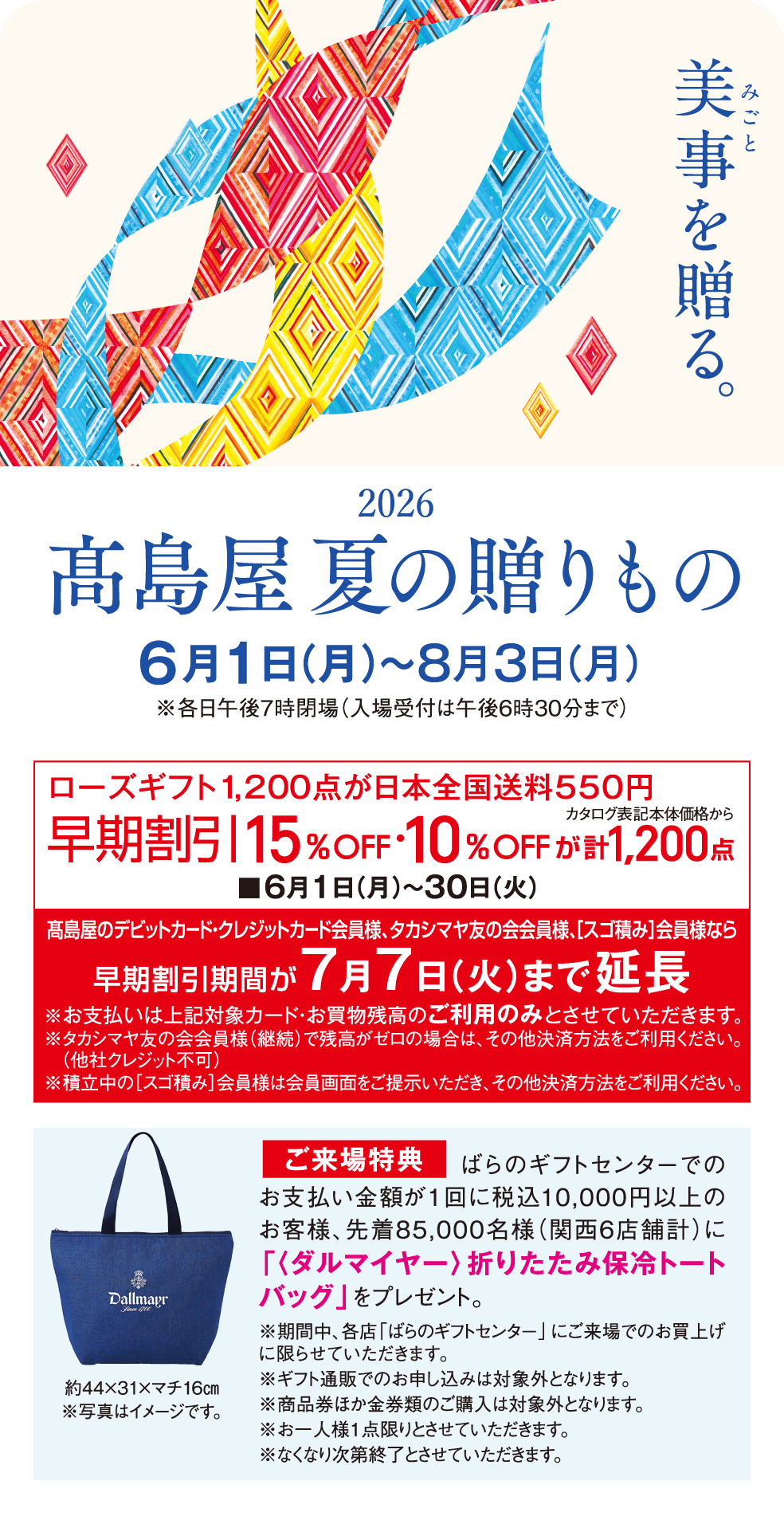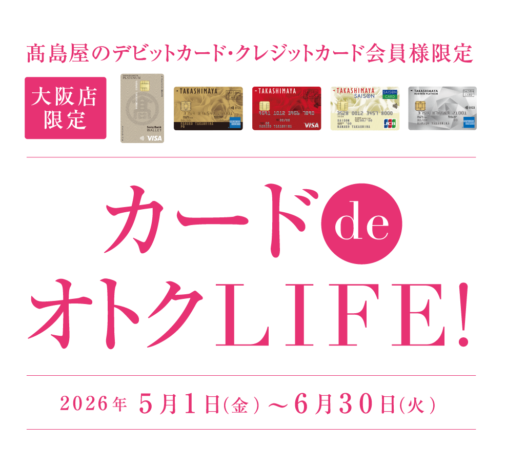 ●「カードdeオトクLIFE!」の優待サービスは「高島屋のデビットカード・クレジットカード」のご利用、ご提示のみとさせていただきます。●高島屋の各クレジットカードご入会当日からご利用いただけます。●高島屋のクレジットカードで優待価格商品をご購入の際は、「クレジット決済ポイント1%」のポイントサービス対象となります(割引サービスは対象除外となります)。カードによりポイント率の異なるお支払い方法がございます。●現金、商品券等によるご入金分はポイント付与対象外となります。●他の優待との併用はできません。●開催期間以前や期間中のご予約・お取り置き商品は、対象外とさせていただきます。●ご進物体裁をご遠慮いただく場合がございます。●特価品は対象外になります。●一部商品の入荷遅れ・生産中止や催し・イベント等が変更、中止となる場合がございます。●商品のご利用方法により税率が変更となる場合がございます。●価格は予告なく変更になる場合がございます。●価格は消費税を含む総額にて表示しています。