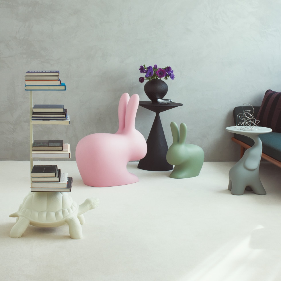ウサギの耳を背もたれにしても、抱きかかえても座れるチェアや、ゾウの鼻が天板を支えるテーブル、亀の甲羅に本を載せるブックケース。これらは、すべてステファノ・ジョヴァンノーニが立ち上げたデザインブランド〈Qeeboo〉のもの。ユーモアとアートが融合したアイコニックなプロダクトです。
