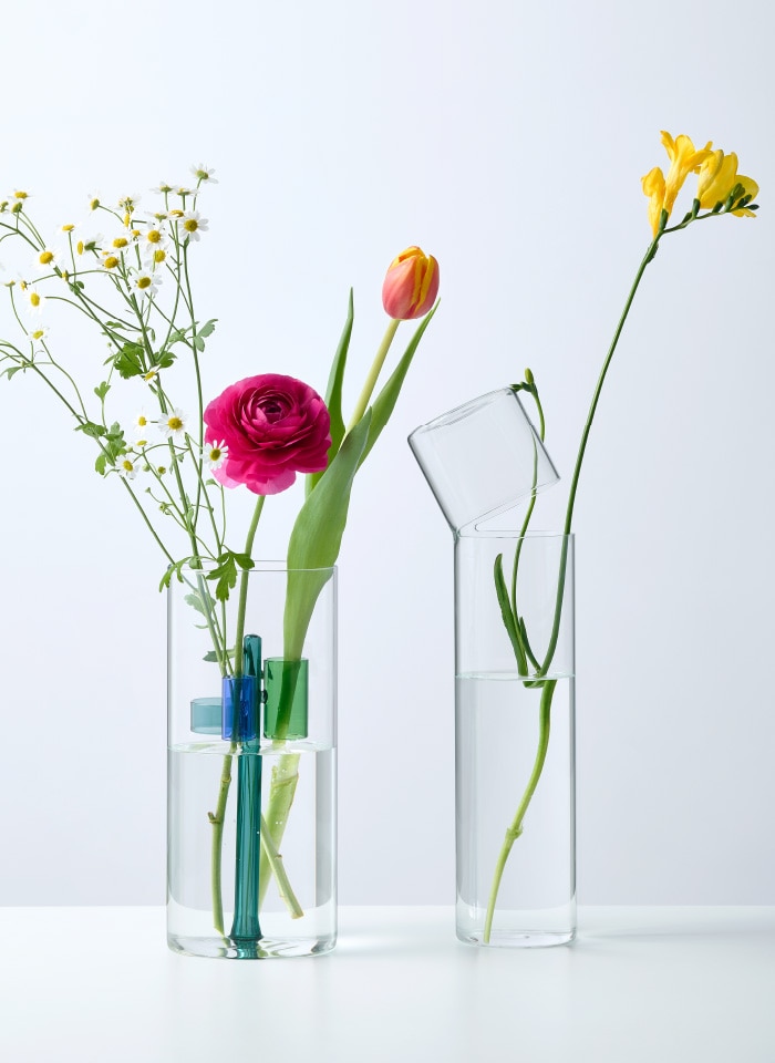 1900年代にドイツで創業し、のちにイタリアのミラノに拠点を移した〈イッケンドルフ〉のフラワーベースは、ユニークな差し込み口や、葉型のホール、切り込みを活かしたフォルムといった遊び心あふれるデザインが魅力。自由なアレンジを楽しめる構造で、花々の美しさを引き立てます。