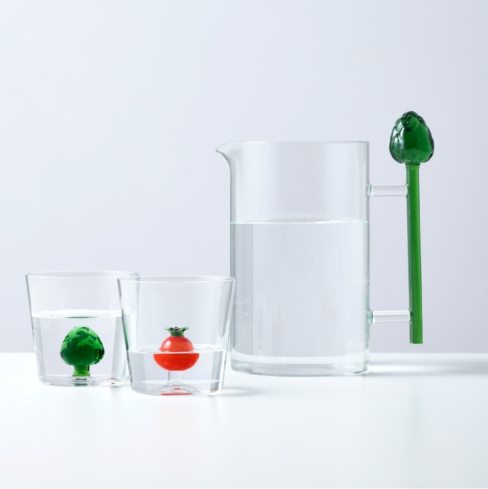 ダイニングに彩りをプラスするテーブルウェア。ピッチャーは持ち手が野菜をかたどったデザインに。ガラスタンブラーは中に野菜のデザインが施されています。どちらも野菜のヘタや模様などのディテールまでが再現された、ガラス職人の技が光るアイテムです。