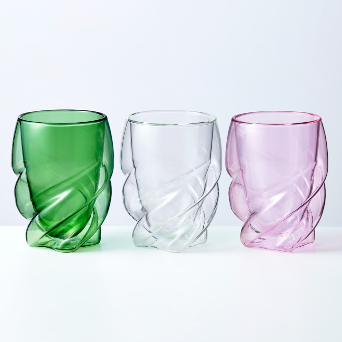 ユニークなフォルムがモダンな印象を与えるグラスは、持った時に手にしっくりとなじみ、使い心地も抜群。二重構造で飲み物が美しく見えるだけでなく、温かいものは冷めにくく、冷たいものはぬるくなりにくいのも魅力です。食卓を華やかにする春らしいカラーが揃いました。