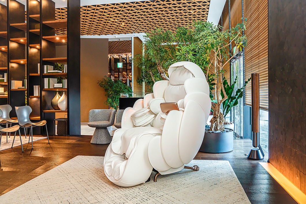 セルフメディケーションの考え方に基づいたリラクゼーションチェア「i COCOON」。高級インテリアに溶け込む優しい丸みのあるフォルムと本革の質感で、身体をゆだね、自然に眠りに落ちていく。穏やかで優しい癒しの時間をお過ごしください。